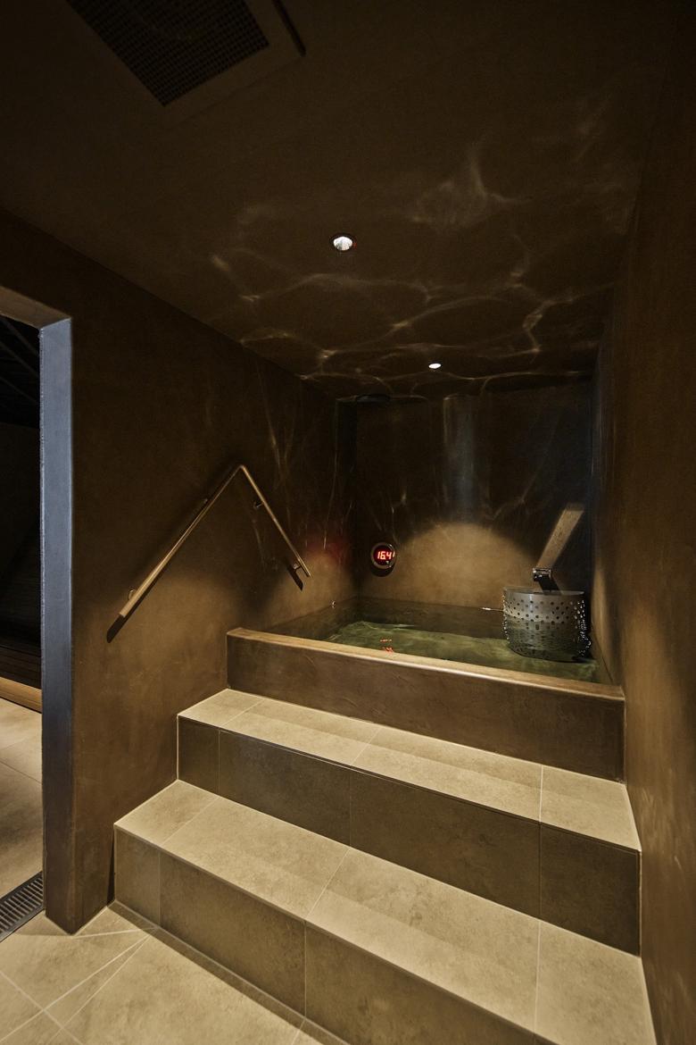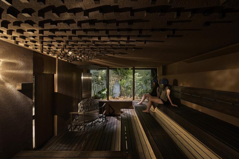 大サウナ室は、一般的な都市型サウナにありがちな閉塞感を取り払い、大きな開口からは坪庭の緑を眺め、その向こうに町の光が柔らかく透けるように配置。
