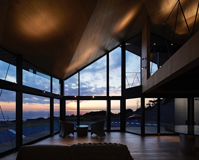 After entering the entrance along a triangular side wall, the outdoor view is temporarily shut off and people find themselves in a gradation of light. There is a folded-plate space that rises towards the second floor, and a semicircular bathroom is placed in the space. By going towards the light while feeling a contrastive structure, a wide-open ocean view enfolds. When entering the living room, the view widens even more in a longitudinal direction to the sky. After the place with a tall framed scenic view, the view become rapidly narrower and then lands beyond the bathroom area once again. The interior sequences are handled as if they are melodies, and the spaces are connected as if accumulating harmonies.