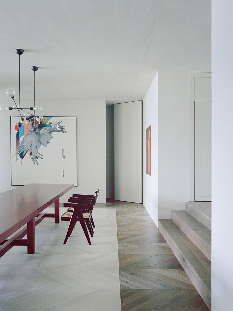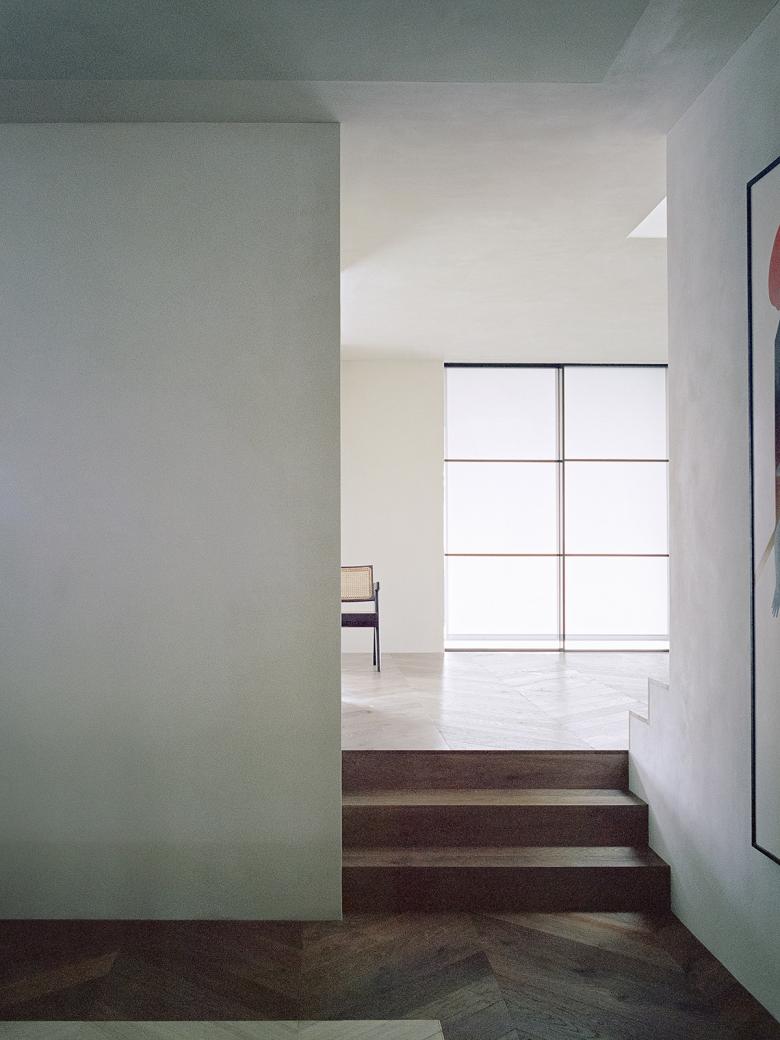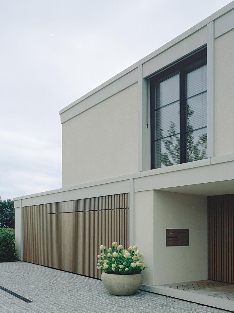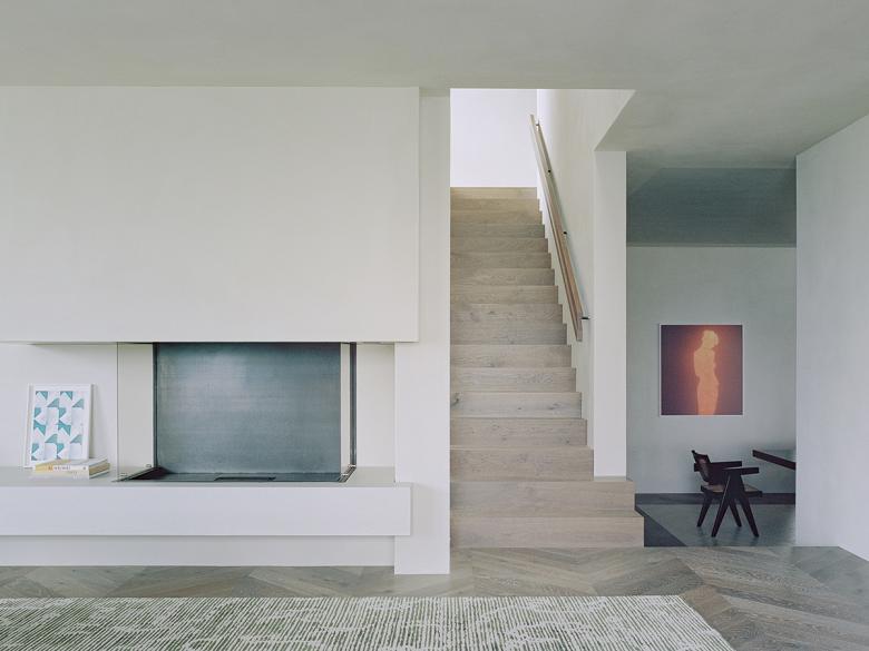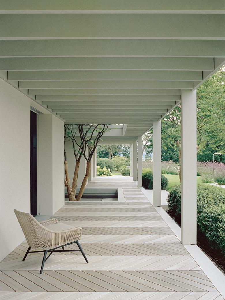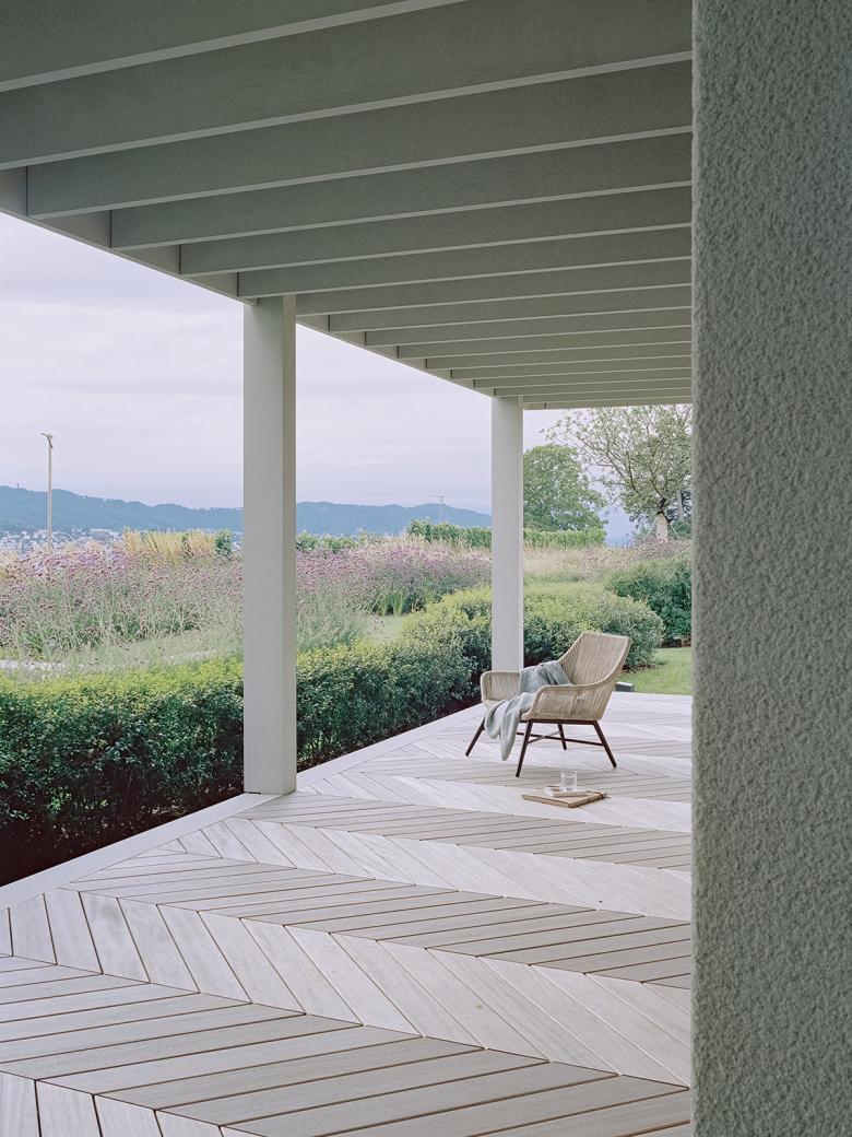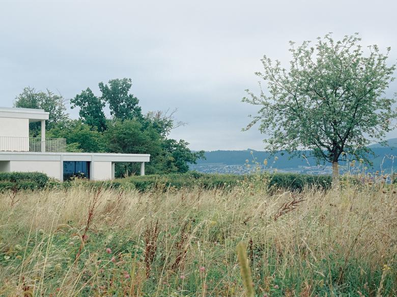 Das Haus steht als Solitär auf einer grosszügigen Wiese, welche den oberen Abschluss eines Weinberges bildet. Eine Raumabfolge aus Entrée, Halle und Aussenhof inszeniert die übergeordnete Achse Richtung Weinberg und See und bildet den Auftakt der symmetrischen Grundrissorganisation. Der Neubau besetzt ein Feld von 24 × 20 Meter und reagiert auf jede Seite mit einem Einschnitt im Volumen. Richtung Weinberg und Zürichsee erfolgt die grösste Zäsur des Volumens. Eine drei Meter tiefe Veranda vergrössert sich in der Achse des Gebäudes zu einem halbgeschlossenen Hof, in welchem ein Solitärbaum von einer abgesenkten Aussenlounge umrahmt wird. Dieser Hofraum bildet den Abschluss einer Reihe von symmetrisch ausgerichteten Repräsentationsräumen, welche die gesamte Tiefe des Hauses bereits beim Eintritt erlebbar machen. Die überhohe Halle ist das Zentrum des Hauses und wichtigster Aufenthaltsort der Familie. Von diesem Raum aus führen zwei Erschliessungsschlaufen als Rundlauf jeweils ins Ober- sowie ins Untergeschoss. Die beiden Schlaufen erschliessen die wichtigsten Räume und lassen ein unendliches Durchschreiten des Hauses zu. Die naturnahe Materialisierung aus erdigem Kratzputz wird von einem Skelett aus filigranen Glasfaserbetonelementen.