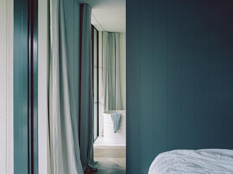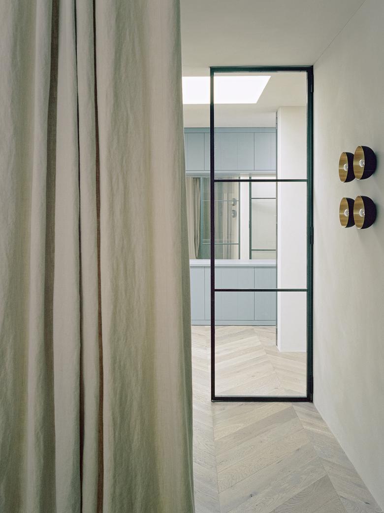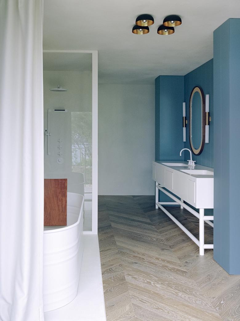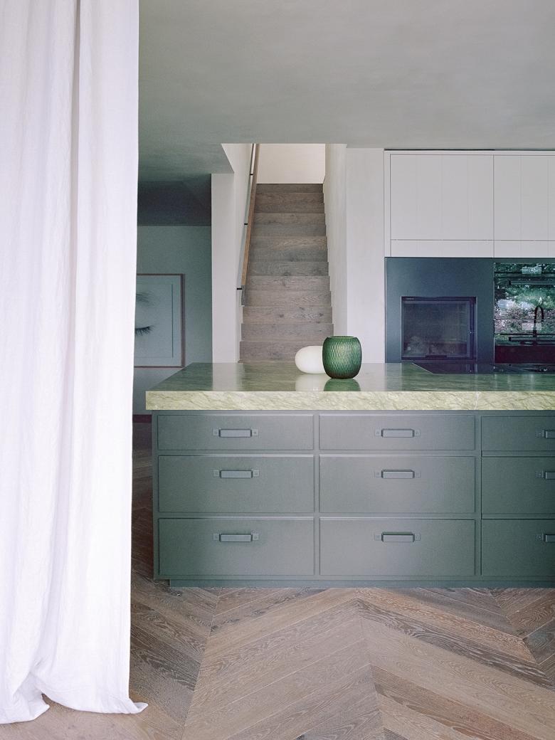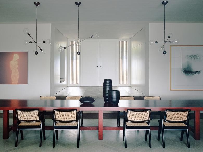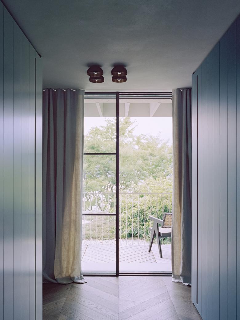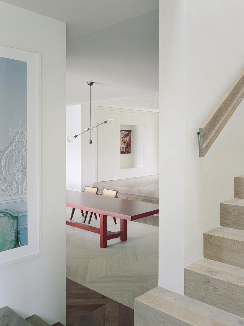 Das Haus steht als Solitär auf einer grosszügigen Wiese, welche den oberen Abschluss eines Weinberges bildet. Eine Raumabfolge aus Entrée, Halle und Aussenhof inszeniert die übergeordnete Achse Richtung Weinberg und See und bildet den Auftakt der symmetrischen Grundrissorganisation. Der Neubau besetzt ein Feld von 24 × 20 Meter und reagiert auf jede Seite mit einem Einschnitt im Volumen. Richtung Weinberg und Zürichsee erfolgt die grösste Zäsur des Volumens. Eine drei Meter tiefe Veranda vergrössert sich in der Achse des Gebäudes zu einem halbgeschlossenen Hof, in welchem ein Solitärbaum von einer abgesenkten Aussenlounge umrahmt wird. Dieser Hofraum bildet den Abschluss einer Reihe von symmetrisch ausgerichteten Repräsentationsräumen, welche die gesamte Tiefe des Hauses bereits beim Eintritt erlebbar machen. Die überhohe Halle ist das Zentrum des Hauses und wichtigster Aufenthaltsort der Familie. Von diesem Raum aus führen zwei Erschliessungsschlaufen als Rundlauf jeweils ins Ober- sowie ins Untergeschoss. Die beiden Schlaufen erschliessen die wichtigsten Räume und lassen ein unendliches Durchschreiten des Hauses zu. Die naturnahe Materialisierung aus erdigem Kratzputz wird von einem Skelett aus filigranen Glasfaserbetonelementen.