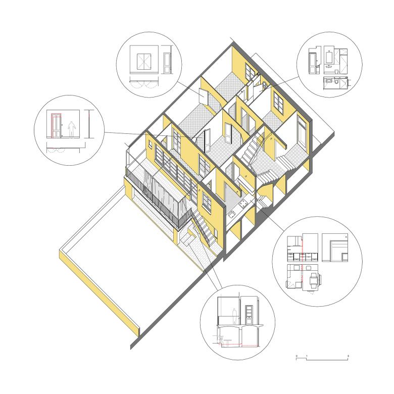 Se opera manipulando y aumentando los pasos entre estancias. Abriendo una ventana de antepecho bajo o cambiando la configuración de una puerta se intensifica el vínculo entre habitaciones sin renunciar a la capacidad de independizarlas. Ensanchando el paso entre dos espacios minúsculos se reorganiza la cocina para albergar una mesa. Equipando el baño con un armario se alojan las nuevas instalaciones y se obtiene una mampara escamoteable para la ducha.