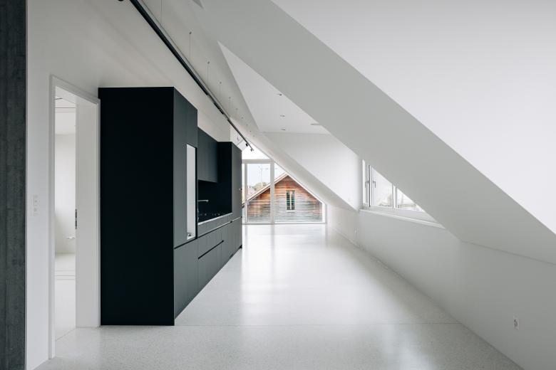 Auch hier konnten wir auf unser breites Bodenbelagssortiment zurückgreifen. Im Kellergeschoss bauten wir neben Dämmung und Unterlagsboden, unseren Haypanol® D Kunstharzbodenbelag, inklusive Hohlkehlsockel ein. In den darüberliegenden Geschossen einschliesslich dem Treppenhaus, wurden Dämmung, Unterlagsboden und als Endbelag unser SURFATEX® Terrazzo eingebracht. Dieser wurde mit feinkörnigem, weissem Marmor und Weisszement als Bindemittel ausgesucht. Für das gewisse Etwas wurde Perlmutt dazugefügt, dieser verleiht den Flächen, neben dem bunten Schillern je nach Lichteinfall, eine warme Note.