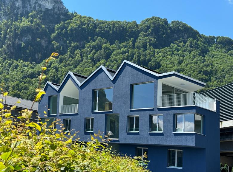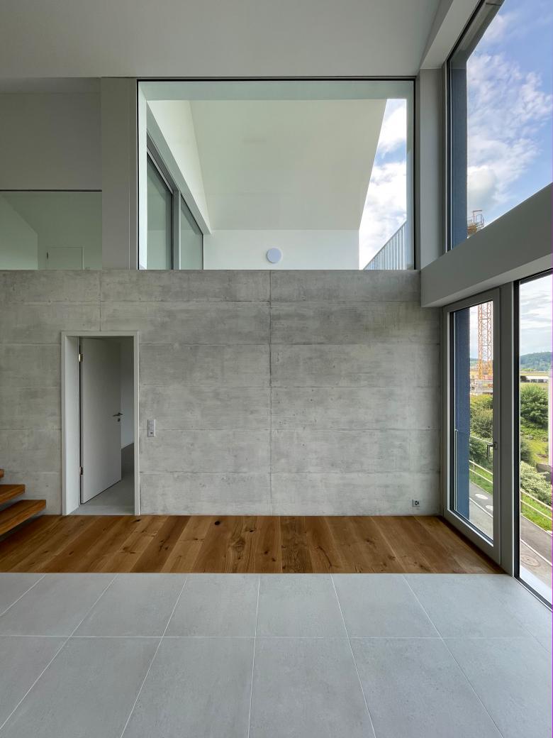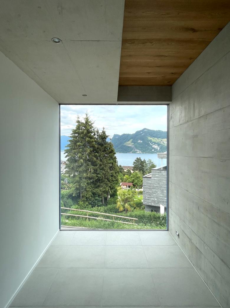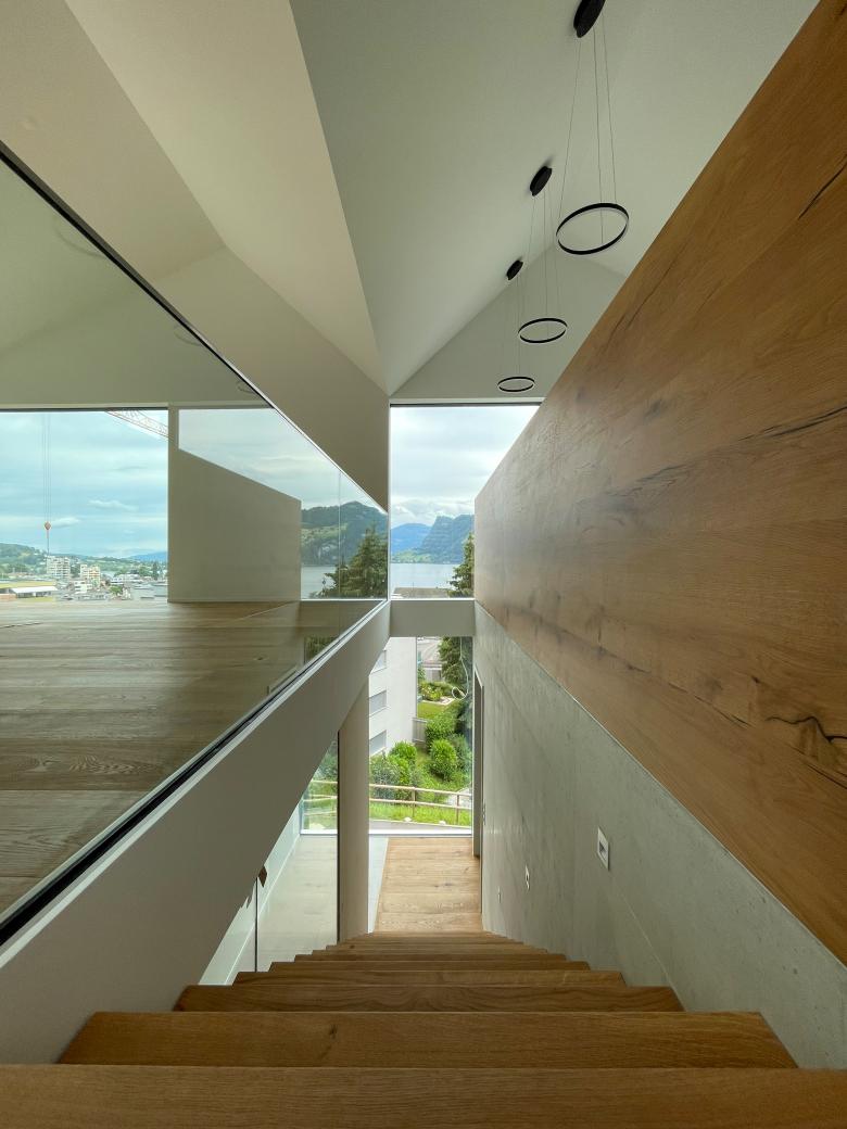 Die Lage des dreieckigen, schmalen Grundstücks ist gegen Osten geprägt durch eine herrliche Aussicht auf den Vierwaldstättersee, im Westen grenzt es unmittelbar an die Autobahn. Davon ausgehend wird das Raumerlebnis entwickelt mit einem über drei Geschosse organisierten Wohnen.
