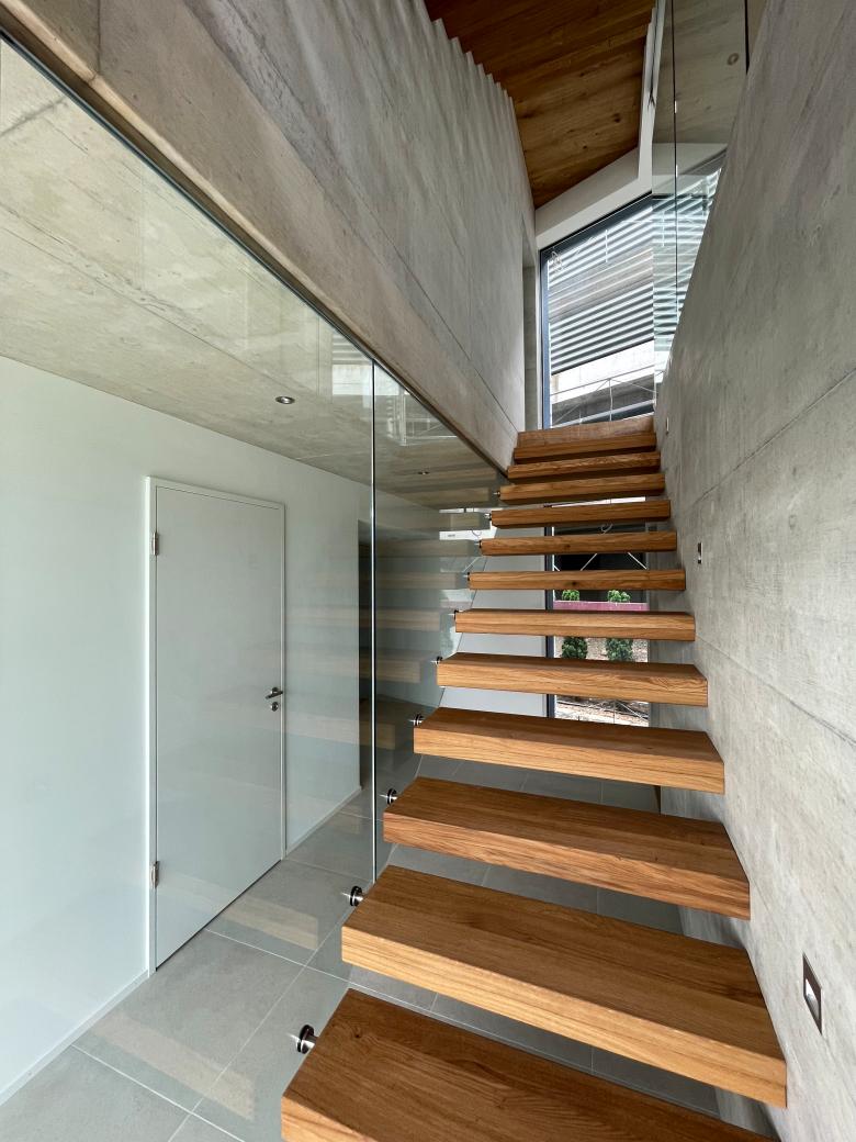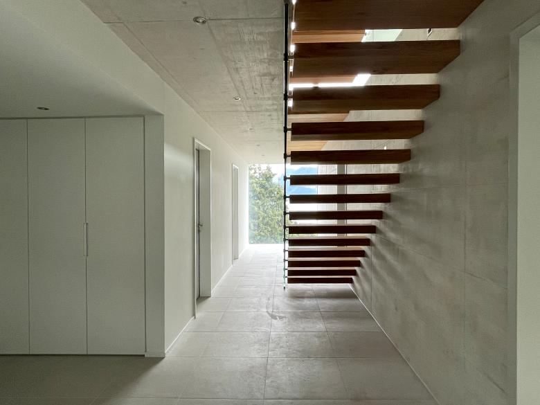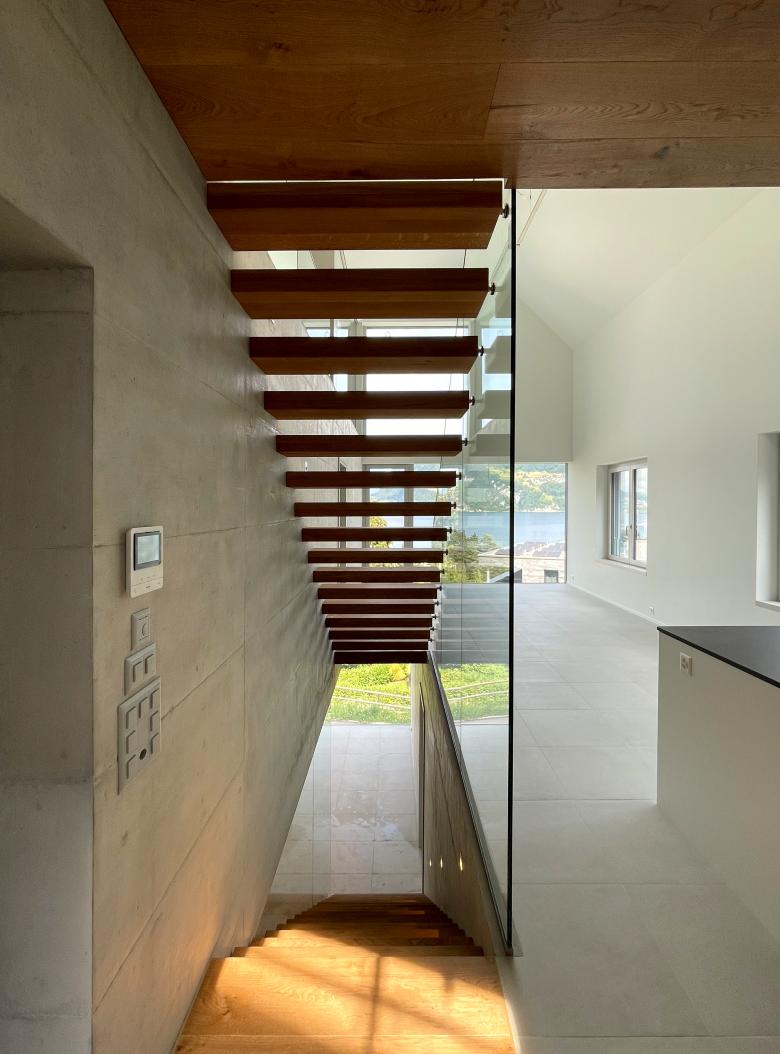 Abschliessbare Zimmer und Nasszellen werden so gestapelt, dass ein vertikaler Bewegungsraum mit wechselseitig angeordneten Köpern mit auskragenden Treppen entsteht. Die vertikale Erschliessung wird zum Ort, wo man die spezielle Lage des Hauses erlebt. Man bewegt sich immer entweder gegen den Hang oder mit Blick auf den See. Der «Kluftraum» geht nahtlos in die Wohnräume über. Durch diesen erlebnisreiche Raumfluss entsteht Grosszügigkeit.