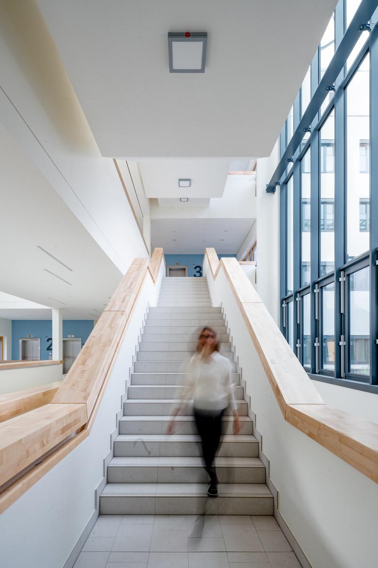 Eine großzügige Magistrale bildet das Rückgrat des Neubaus, über die alle wichtigen Adressen unmittelbar erreicht werden können. Die nach Süden ausgerichtete Fassade bringt Tageslicht in das Gebäude, die mehrgeschossigen Lufträume wirken als Klimapuffer und dienen darüber hinaus der sommerlichen Nachtauskühlung.