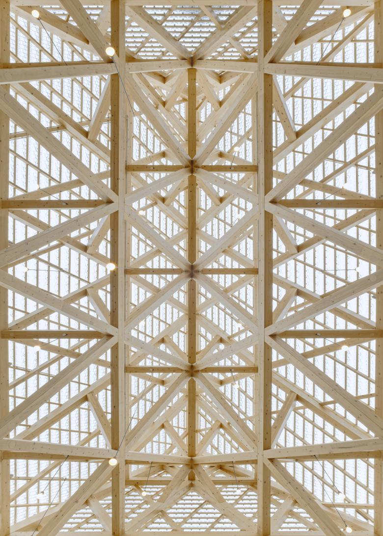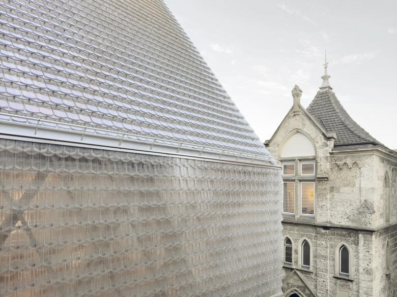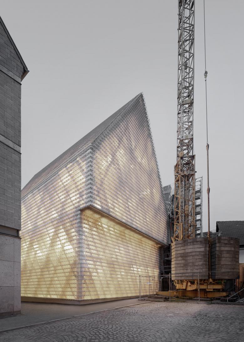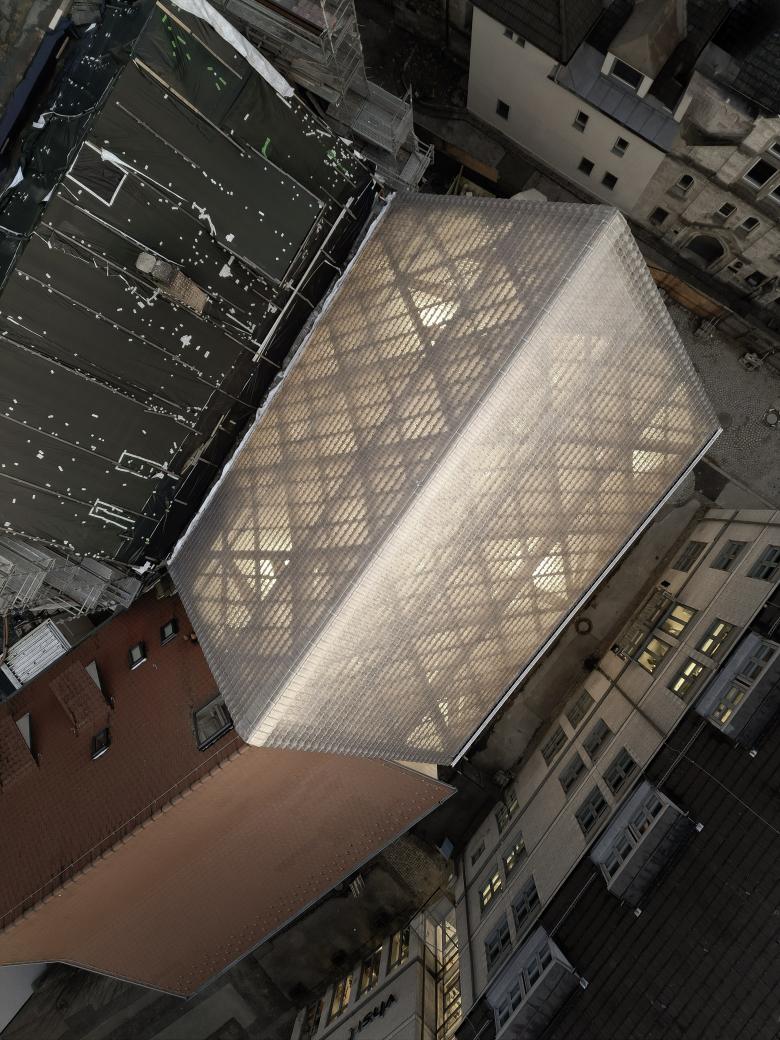Der Neubau zeichnet sich durch ein geometrisch-hochkomplexes Tragwerk aus. Die Tragstruktur wurde so entwickelt, dass architektonische Anforderungen und konstruktive Logik präzise ineinandergreifen und folgt einer klaren funktionalen Gliederung: Eine dreischichtige, graduell abnehmende Unterkonstruktion aus diagonal und horizontal überlagernden Holzstreben trägt die gläsernen Biberschwanzziegeln als Witterungsschutz. Dabei kommt der Neubau ohne thermische Dämmung und Klimatisierung aus und dient auch als Schutzbau für den historischen Keller. Die natürliche Belüftung und Entrauchung des Gebäudes erfolgt ausschließlich über die offenen Fugen der gesamten Gebäudehülle, ohne mechanische Unterstützung.