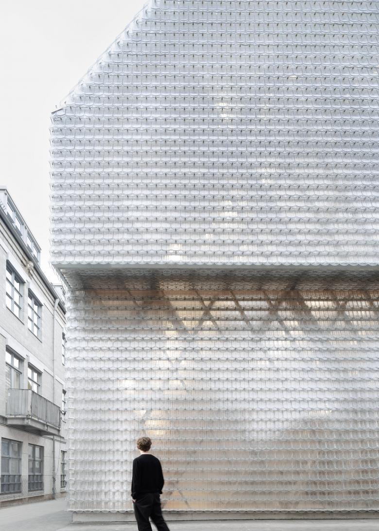 Die innere Struktur besteht aus einem mit heimischem Weißtannenholz gefertigten Fachwerk, das die angrenzende, umsturzgefährdete Häuserzeile abstützt und dabei das verlorene Volumen des historischen Hauses nachbildet. Die Dach- und Fassadenflächen sind mit einer homogenen Schicht aus gussgläsernen Biberschwanzziegeln bekleidet. Je nach Lichteinfall, Reflexion und innerer Beleuchtung ist das dahinter liegende hölzerne Fachwerk mehr oder weniger sichtbar, das Gebäude wirkt durchscheinend oder glitzernd, wie eine Chimäre.