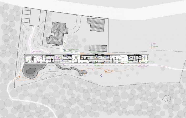 敷地は南北に細長く、崖条例により建物を建てられる範囲が限定されている。悪条件ではあるが、奥行き2.5間を持った縁側のような床を一直線に設け、メインストラクチャーである木架構と、さまざまなアクセスがある開かれた縁側で地域に対する構えをつくろうと考えた。そこに街の人が利用する「カフェ・工房」、「高齢者が過ごすリビング」、「はなれのような座敷と浴室」の3つの機能に外部スペースを挟み込んで配置している。大きな構えとしての架構に対して、負けるように小さな壁やボリュームを挿入して、ひとのための小さな場所を散りばめていった。特に、挿入された建築要素の境界、つまり窓辺を丁寧に設えた。例えば、カフェとテラスの間の窓辺にはデイベットを設け、厚みのあるニッチに体をあずけられるように寸法や建具の種類、素材の選定を行うことで、一人だけれど、他者と一緒に過ごせる「居方」を生み出している。