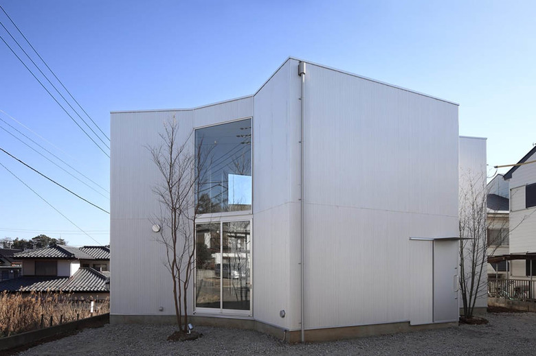 箱部分についてはキッチンや浴室などが収まる必要最低限の広さを910モデュールで構成している。この部分は部屋としてではなく、設備スペースとしてとらえ、生活の中心は、4つの箱が集まった吹き抜け部分である。ここは910モデュールにとらわれずに、隣地の窓との関係や空が見える角度、キッチンから将来、子供部屋になった場合のスペースが見えるなどの要因から箱の角度や位置を決定していった。 クライアントとの長い対話から生まれたこの住宅が、この家族の暮らしにそっと寄り添うような器であってほしいと思っている。