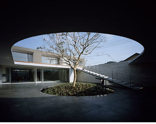 The site is located in a newly developed subdivision on the outskirts of Kisarazu. The site is a series of plots of about 70 tsubos in size, developed in the shape of a hina-dan on a gently sloping southern slope. The ground level of the two parcels is about 80 cm different from each other, and we wondered if we could make use of this subtle difference in elevation, which is often seen in this residential area. The owners are a family of three, a working couple and a girl in high school, who are often away from home, so they requested a high level of security, privacy, and a low-maintenance garden. The building was designed in an orthodox layout, with rooms arranged in an east-west direction on the north side of the plot, and all rooms facing south. The south plot has a square plan of 12m on each side, and is surrounded by a 2.7m-high wall. Rather than saying that the exterior space is enclosed by walls, it might be better to say that the exterior space is created by drilling holes in the roof and floor of a box that has a floor, walls, and roof. The box in that garden is floated at a subtle height of 80 cm, the difference in the level of the landscaping. A round hole with a diameter of 6 meters was drilled in the slab, through which the greenery of the raised hill protrudes from the ground, making the viewer aware that this garden is floating in the air. The theme of the project was to create a garden with this unique spatiality, and the building and approach were planned around this floating patio, the "Floating Patio“.