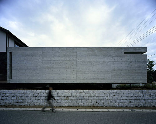 The approach sequence begins with a gate in a freestanding wall along the road on the east side. Through an opening in front of the gate, a part of the Tsukuyama hill forms a backdrop to the sculpture created by Hidemiki Kobayashi, a metal forging artist, for this site. Climbing up the ramp along the freestanding wall, the entrance porch is located under the volume of the second floor that overhangs the top. As one enters the front porch, the sculpture mentioned earlier is reflected in the water through the water table in front of the porch.