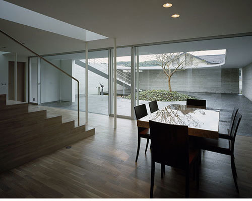 The first and second floors are connected by a wooden staircase that divides the living room and dining area, and an external staircase that connects the courtyard to the second floor terrace, creating a circular flow. The three gardens are the front garden at the southeast corner of the site, which is open to the town, the raised courtyard at the center of the building, and the tsuboniwa (small garden) at the far end of the building. The two lights are the light coming through slit-like holes, which we call slots, one at the top of the internal staircase and the other in the glass-floored corridor area. The light is cast into the back of the first floor. We hoped that these three gardens and two lights would create various scenes as we move about in our daily lives, creating a richer spatiality in this residence.