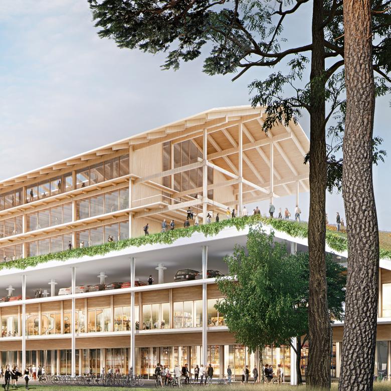 Das Sekundarschulhaus für rund 600 Schüler ist Teil des neben dem Migros-Gebäude geplanten Neubaus, in den obersten Geschossen. Bis zum Erdgeschoss der Schule wird die Tragstruktur des Bestands als Stahlbetonskelett fortgeführt. Für die oberen Geschosse, also die eigentliche Schule, ist entsprechend dem Nutzungswechsel auch ein Materialwechsel geplant. Das Tragwerk ist als Leichtbaukonstruktion in Holz, Stahl, Verbund- oder Hybridbauweise gedacht, was neben der Reduktion der Gebäudelasten auch eine Beschleunigung des Bauablaufes aufgrund des hohen Vorfabrikationsgrades ermöglicht. Die Vertikallasten werden über das definierte Stützenraster und die Fundation in den Untergrund geleitet. Die Aussteifung erfolgt über optimal angeordnete Kerne und Wandscheiben, die den Nutzern grösstmögliche Flexibilität gewährleisten.