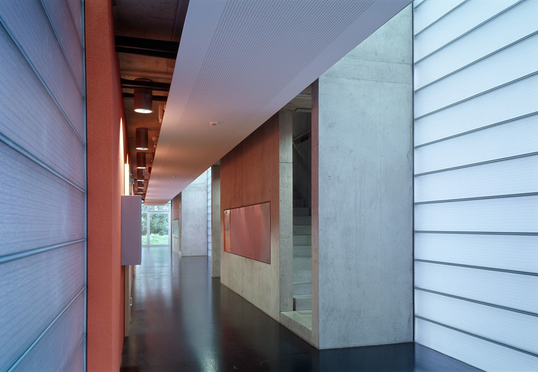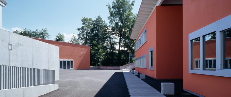 Die Bauten werden bewusst niedrig gehalten und in das Terrain eingebettet. Der Schulraumtrakt übernimmt die Bebauungsstruktur der Ebene, die Aula, sowie die in der zweiten Etappe vorgesehene Turnhalle mit dem Rasenspielfeld, gliedern sich in die Struktur des Grentscheltals ein.