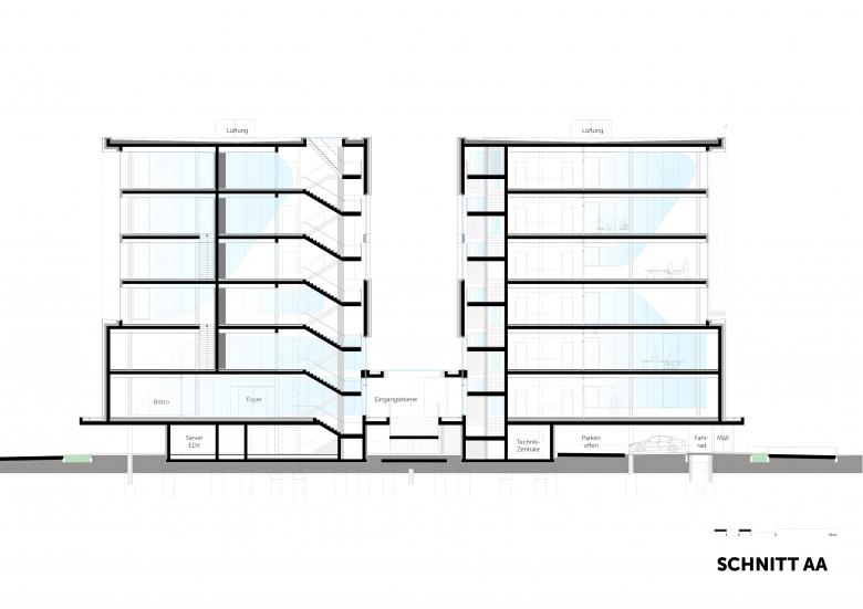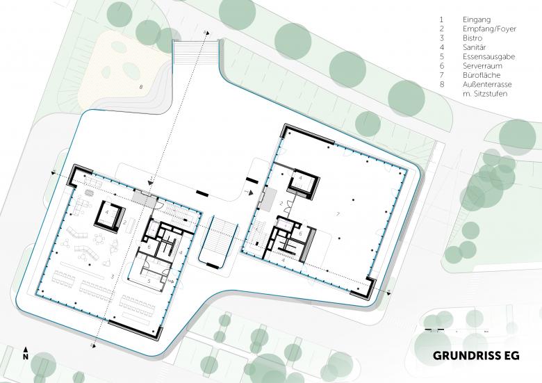 Die Büroetagen sind großzügig und offen konzeptioniert, auf Innenwände wurde weitgehend verzichtet. Hierarchiefreies und kooperatives Arbeiten sind in der Gebäudestruktur angelegt. Kommunikative Gemeinschaftsbereiche und konzentrierte Arbeitsbereiche durchmischen sich unaufdringlich mit urbanem Mobiliar. Das Konzept des papierlosen Büros ermöglicht leichte, transparente Möblierung und weitgehend unverstellte Blicke nach draußen. Über eine eigens vom Bauherren entwickelte App steuern die Mitarbeiter so ziemlich alles im Haus: sie können ihr Lunch aus der hauseigenen Foodbar auswählen oder sich in der Pause durch die umgebenden Grünanlagen navigieren lassen. Zur Plastikvermeidung wird Wasser aus dem eigenen Trinkbrunnen zur Verfügung gestellt, der Teppich wiederum besteht aus recycelten Fischernetzen und Plastikflaschen. Moderne Heiz- und Kühldecken sorgen in den Büros für angenehmes Raumklima. Notwendige Kälte und Wärme wird über Geothermie mit 24 Sonden in 130 Meter Tiefe generiert und Strom mit einer Photovoltaikanlage auf dem Dach produziert, womit das Gebäude zu einem 0-Energie Haus wird.