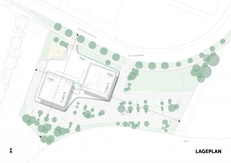 Bauherr und Nutzer des Gebäudeensembles, das sehr prominent sichtbar an einer der meistbefahrenen Autobahnen Deutschlands steht, ist die Karlsruher FC Gruppe. Das Ingenieurbüro mit über 300 Mitarbeitern arbeitet sowohl für Porsche als auch an innovativen Krankenhauskonzepten der Zukunft. Der Gebäudeentwurf von 3deluxe soll daher Innovation, Nachhaltigkeit, Effizienz und signifikantes Design in einem klaren Entwurf vereinen. Ein Würfel bietet das baulich ökonomischste Verhältnis von Außenfläche zu Volumen und stellt somit das unter Nachhaltigkeitsgesichtspunkten optimal effiziente Gebäudevolumen dar. Die zwei identischen Würfel der FC Cubes sind gegeneinander verdreht und stehen auf einer großen, schwebenden Grundplatte, unter der eine offene Tiefgarage untergebracht ist. Durch die signifikanten organisch geformten, geschossübergreifenden Fensterflächen verschmelzen die zwei Einzelwürfel je nach Perspektive zu einem skulpturalen Gesamtbild mit unterschiedlicher reizvoller Erscheinung. Durch die großzügige Verglasung werden die modernen, offenen Büroinnenräume von allen Seiten gut belichtet und bieten allen Arbeitsplätzen schöne Aussichten. Die reduzierten Gebäudedetails zusammen mit den durchdacht gesetzten Diagonalen und Radien in der Fassade geben dem Gebäude seine Signifikanz und Einmaligkeit.