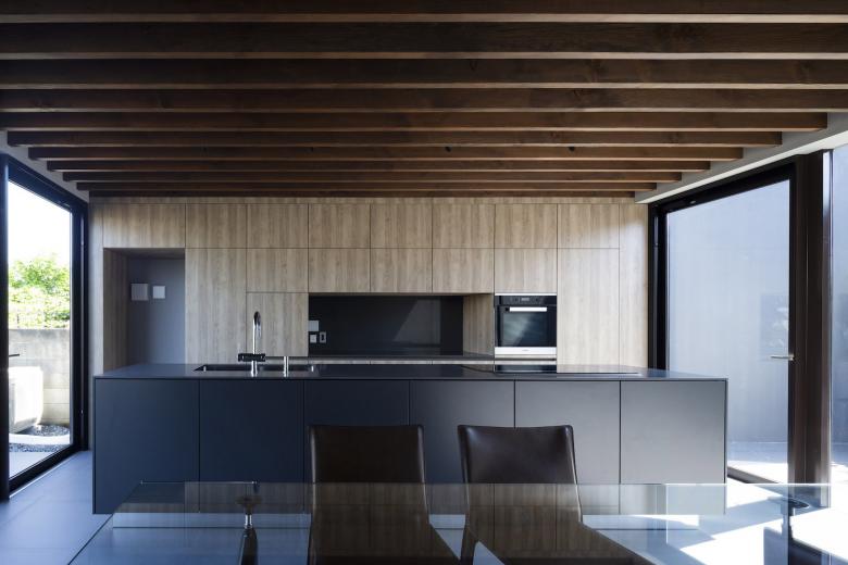 エントランス土間の延長にあるパブリックダイニングは、家族のキッチンとしてのみならず、ゲストをもてなす客間空間としても機能している。デザインと機能を併せ持つドイツのジーマティック社のアイランド型カウンターキッチンは、さながらビストロレストランのような雰囲気だ。