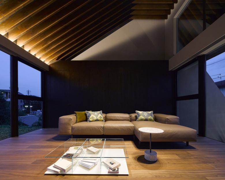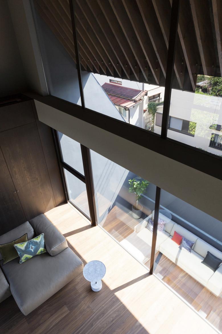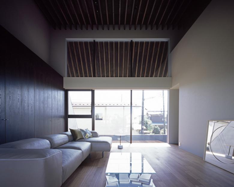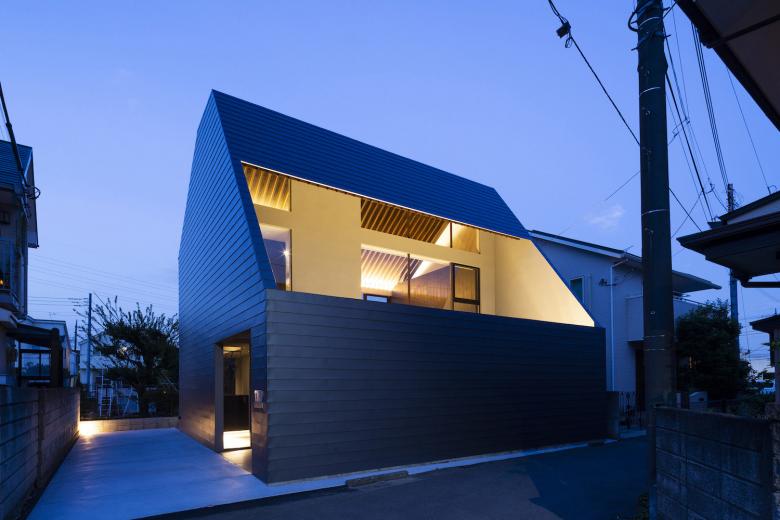 メタリックグレーのガルバリウム鋼板の屋根と外壁がモノコックな外観をつくりだしながら、生活者のプライバシーを確保し、道路面からは1階での生活の様子を窺うことはできない。屋根面に開けられた大きな開口からは室内に十分な光が降り注ぎ、コンパクトな空間の解放感を増幅させている。