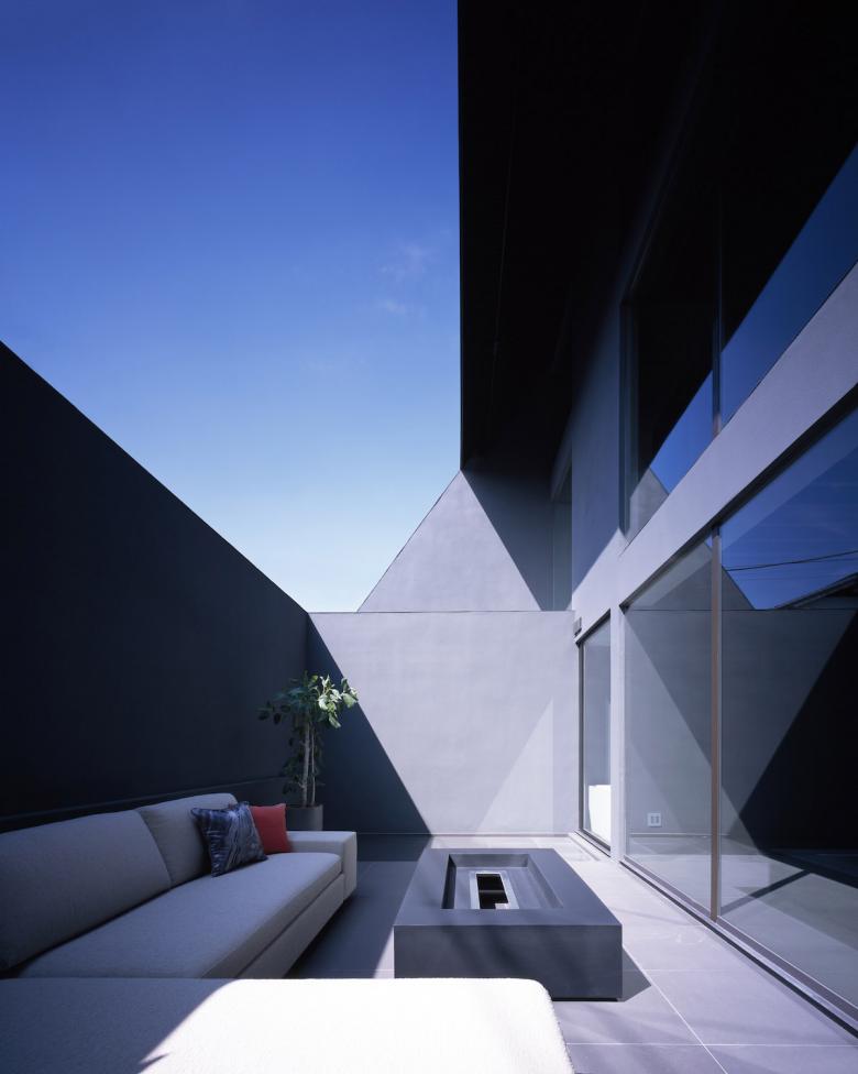 大きな開口部と連続する外部テラスはアウトドアリビングとして機能し、屋外ソファ等を設けることでアウトドアパーティーが楽しめる。中庭形式になっていることからプライバシーも保たれ、道路側とは思えない落ち着いた空間が広がっている。