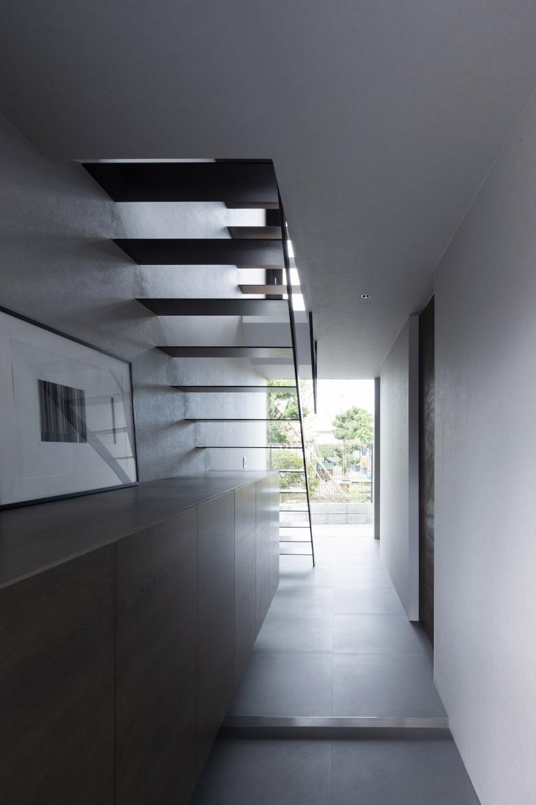 1階エントランスは、階段と水廻りの間から敷地奥の風景が望める仕掛け。