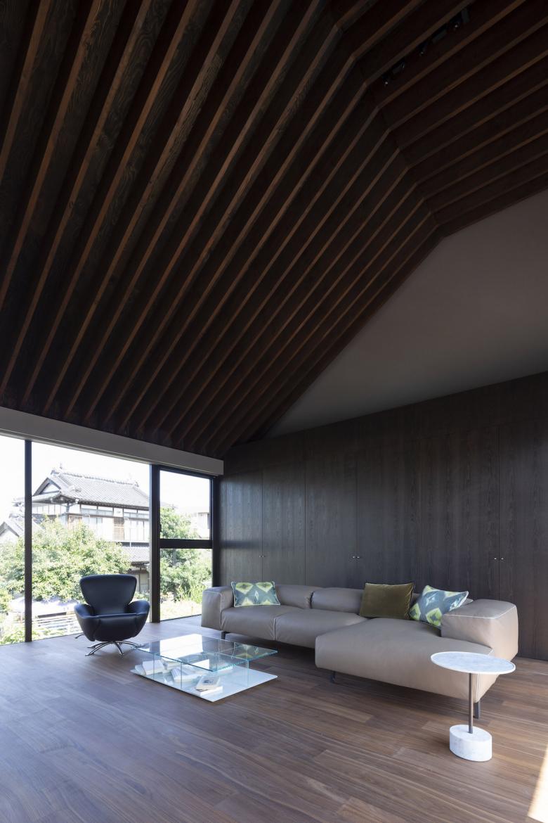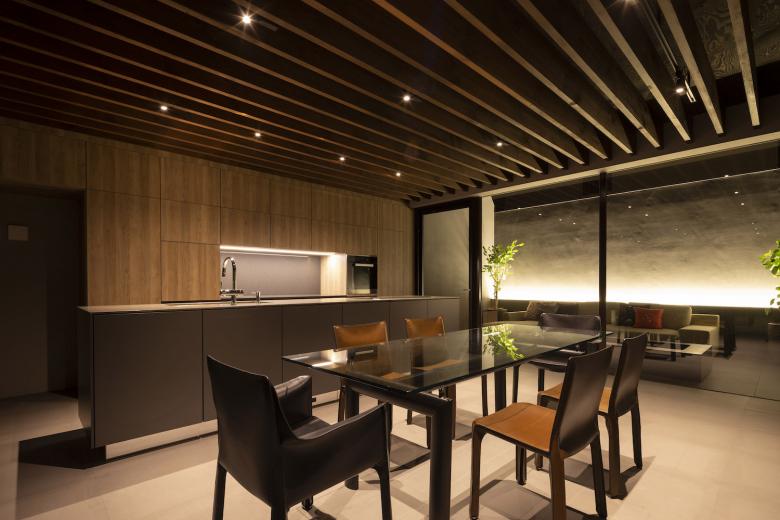 大きな吹き抜けやロフトと一体になった2階は、天井高を活かしたリビング空間として機能する空間。垂木現わしと一体化した軒先の繊細な連続感が空間に広がりをつくりだし、夜には間接照明の効果による優しい光が空間全体を包み込み幻想的である。一階のレストランでの食事の後はここで寛ぐことができる、いわばオーベルジュのような家である。