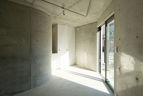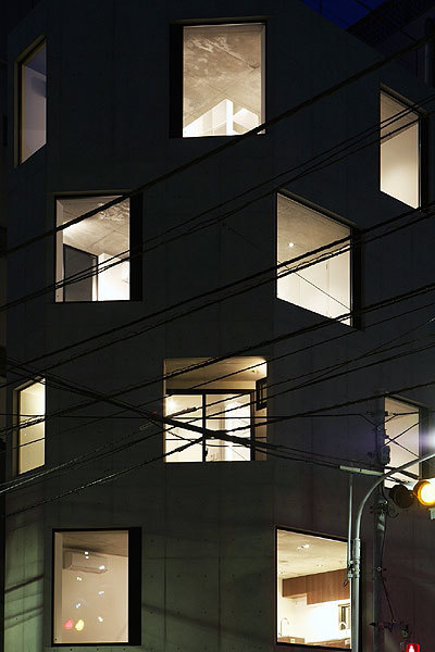 内部には開口部からの景色と、様々な方角から注ぎ込む光により充満された空間が生まれた。各階をワンルームにし、あえて仕切らず繋げることで、建築面積7坪の狭小住宅とは思えない広がりが感じられる。新旧が混在する周辺のシンボル的建築である。