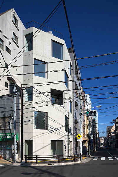 敷地は僅か9坪の下町の商業地。1階を店舗とし上階をオーナー住宅とした。外観は角地の特性を生かし、コンクリートとガラスを市松模様に配し、界隈のモニュメントとなることを意識。