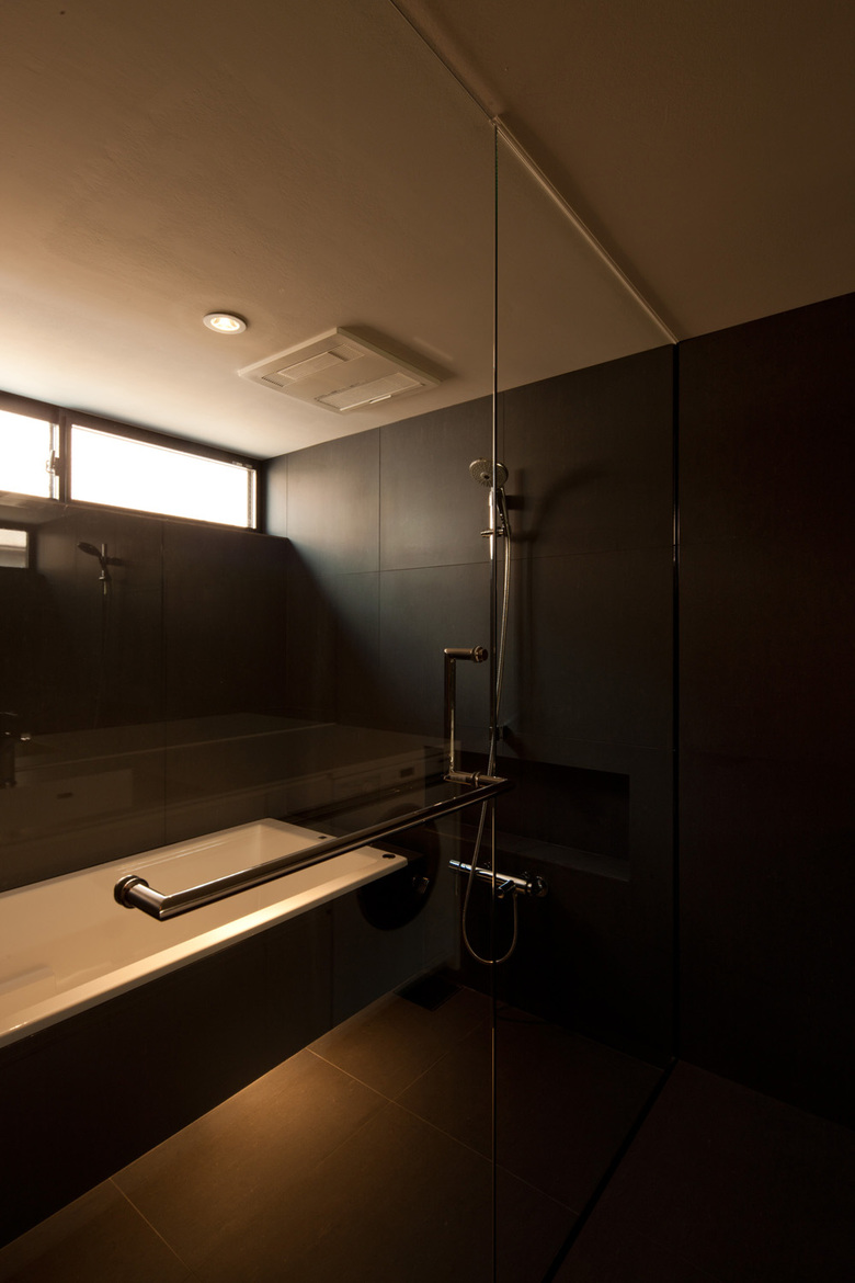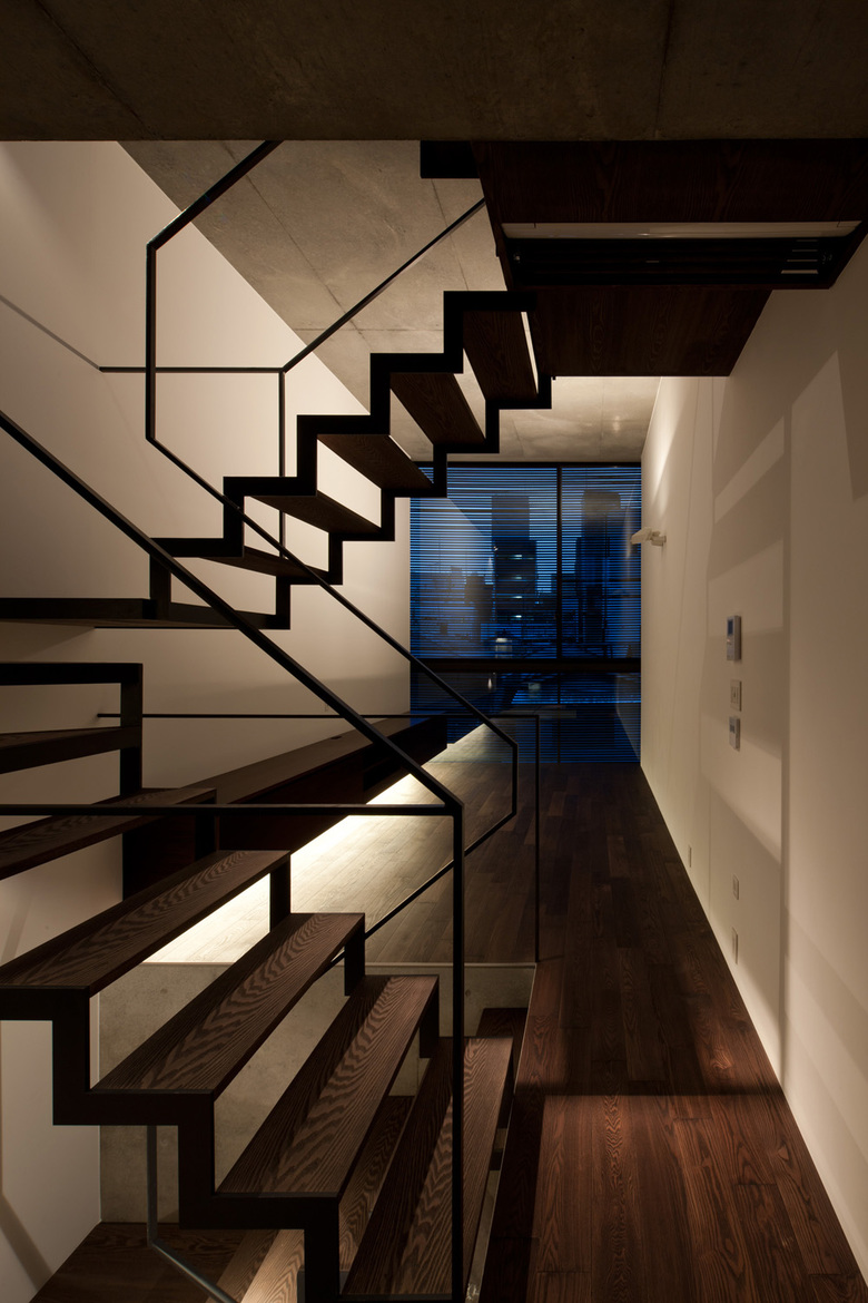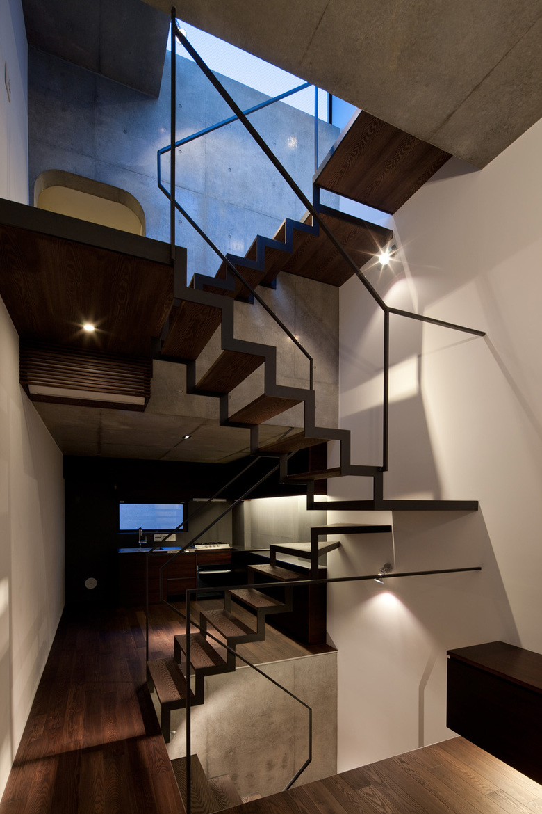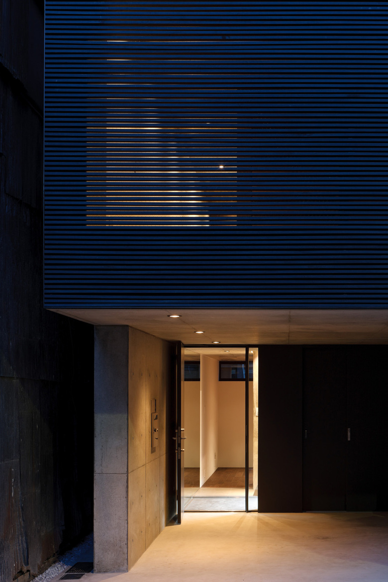 木造古家が密集する台東区周辺には狭小敷地が多い。30代単身男性の建主は自身が経営する会社から程近いこの場に生活の拠点を求めた。間口が狭く奥行きが深い敷地に対し、大型車一台分のピロティガレージが確保できるようRC薄肉ラーメン構造を採用。建物中央を貫くストリップ階段により手前と奥の空間が緩やかに繋がり、内部を吹抜けを介したスキップフロアによる立体的な構成とすることで住宅内を縦に散歩できる空間とした。西側ファサードを木製ルーバーで覆うことで西日と外部の視線を制御しつつ室内の採光を確保。ガラス張りの塔屋部から降り注ぐ光のシャワーが小空間内に充満し、RC打ち放しのブルータルな空間に深い陰影を刻んでいる。