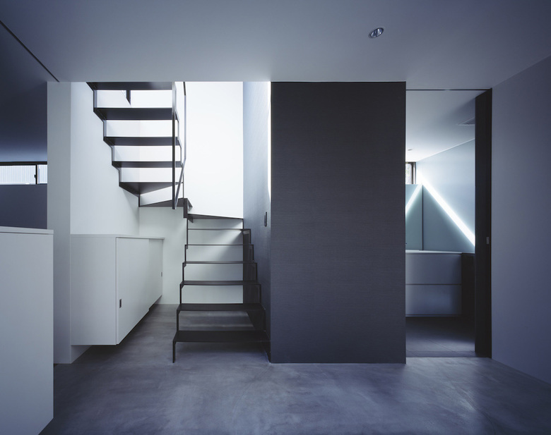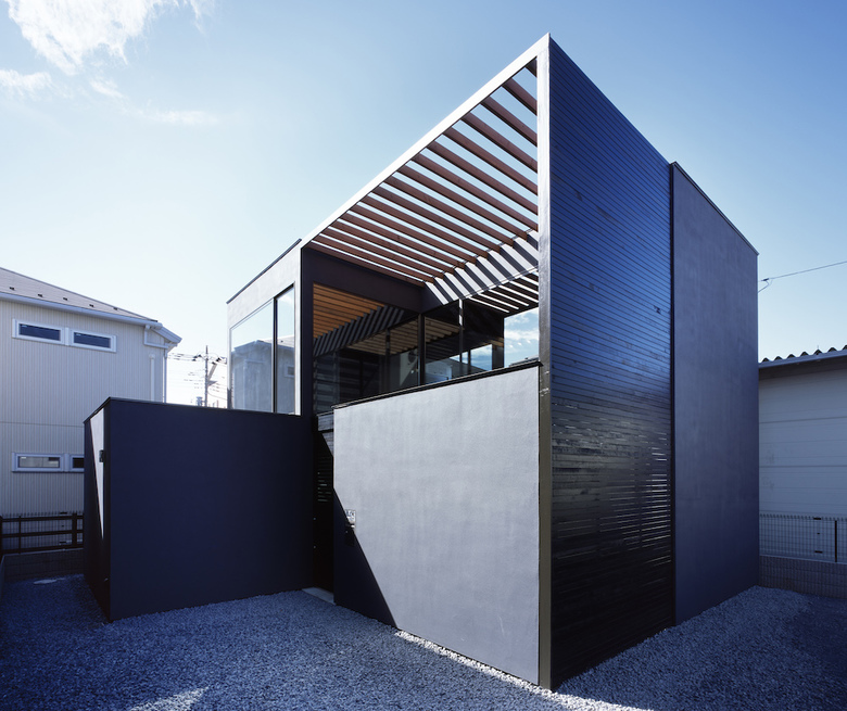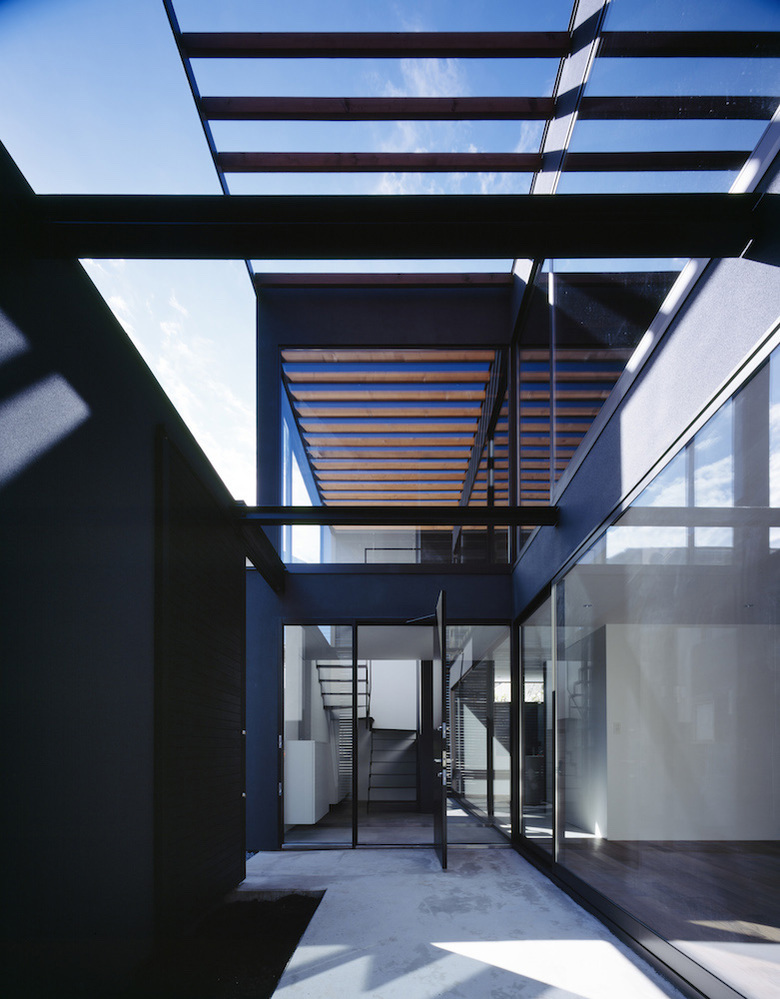 サーフィンが趣味のご主人は、両親が所有する土地の一角に西海岸のケーススタディハウスのような解放感溢れる住宅を求めて計画がスタート。月極駐車場の奥に位置する住宅であることから、視線の問題を考慮し、外壁面にはあえて開口部を設けないファサードとした。中庭を取り囲むシンプルなL型平面とすることで工事コストを抑え、中庭とエントランスアプローチを兼用することで生まれた程良い中間領域が、内外のスイッチとして機能している。