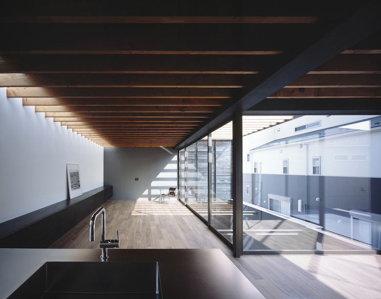 2階天井の一部にスリット状のスカイライトを設け、降り注ぐ自然光のシャワーが壁面に陰影を刻むシーンも演出。また、垂木の間に設けたLEDランプによる建築化照明が主体構造であるSPF材や野地板を美しく照らし、ドラマチックな光のグラデーションが生みだされている。中庭上部のパーゴラの下面に柔らかいアッパーライトを照射することで浮遊感が溢れる夜のシーンをつくりあげている。