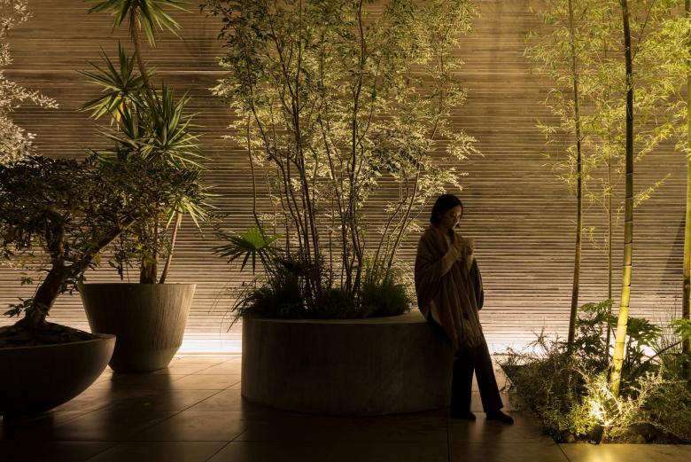 玄関正面からのアイストップになるように竹林を配した南側メインコートは、リビングや書斎、寝室に面していることから、愛犬を含めた家族全員がアウターリビングで思いのままに寛ぐことができる。