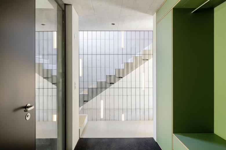 Mit der zweigeschossigen Kubatur nimmt das Haus Rücksicht auf die bestehende Bebauungsstruk-tur des Quartiers. Im Erdgeschoss werden die Wohn- und Essbereiche angeordnet, im Obergeschoss die Schlafbereiche. Auf ein Attikageschoss wird verzichtet.