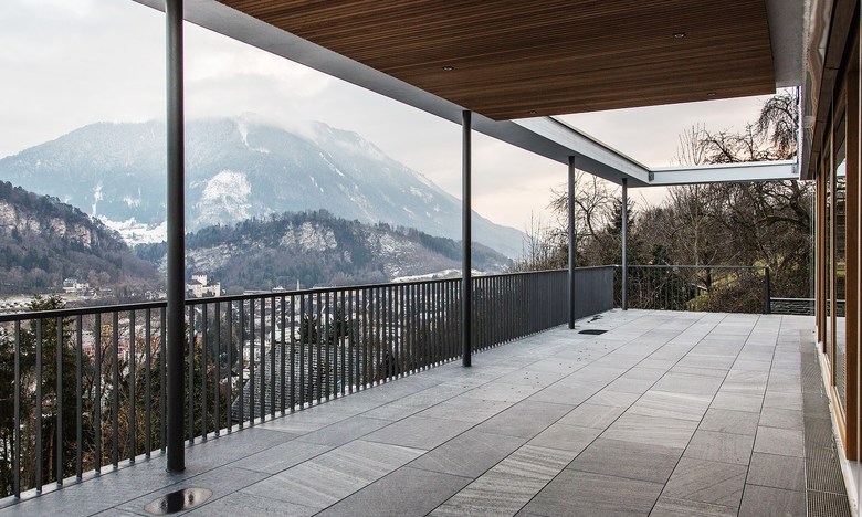 Das Einfamilienwohnhaus ist auf einem nach Süd-Osten orientierten Hanggrundstück in Feldkirch-Levis gelegen. Der Neubau staffelt sich in vier Ebenen dem Hangverlauf folgend. Über eine Zufahrt von der Straße erreicht man den Vorplatz mit Garage, Lager und dem zurück versetzten Hauseingang. Das Erdgeschoss, welches völlig eingegraben im Hang sitzt, umfasst Lager sowie Technikräume. Das 1. Obergeschoss beherbergt die Schlafräume mit Bädern und Ankleiden. Außerdem ist hier ein Gästezimmer, ein Büro, sowie hangseitig die Waschküche platziert. Die Schlafräume orientieren sich talwärts zu einer großen Terrasse. Das Wohngeschoss ist im 2. Obergeschoss untergebracht. Hier erstreckt sich ein großzügiger Wohn/Essbereich mit offenem Kamin, sowie die Küche. Hangseitig gliedert sich ein Innenhof an den Wohnbereich an. Talseitig befindet sich eine große teilweise überdeckte Terrasse mit wunderschönem Ausblick über die Stadt Feldkirch. Über dem Stiegenhaus erhellt ein großes Oberlicht den Gang und das Stiegenhaus. Das Einfamilienhaus wurde in Massivbauweise erstellt. In den Fassaden wechseln Flächen von Naturstein und weißer Putzfassade ab. Die Stützmauern des Untergeschosses wurden in Sichtbeton ausgeführt, welche mit Rankpflanzen bewachsen werden.