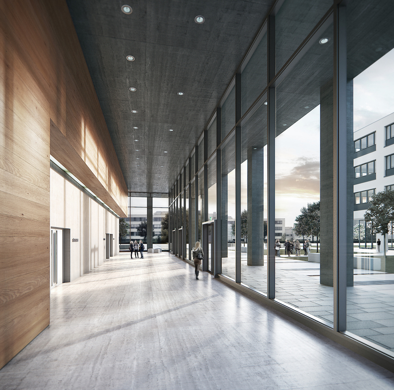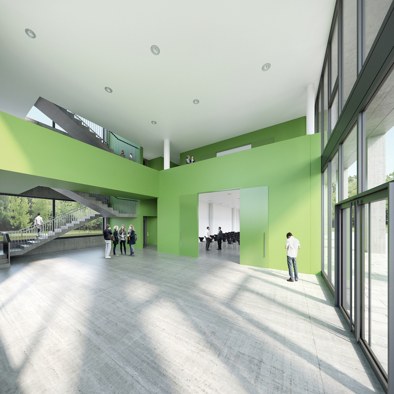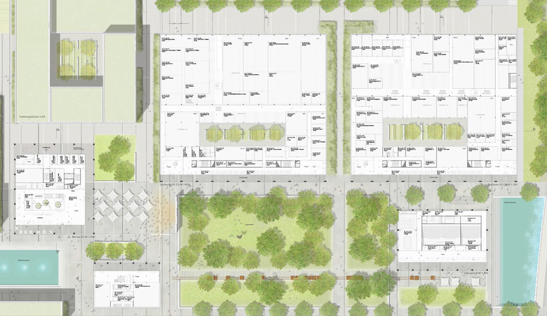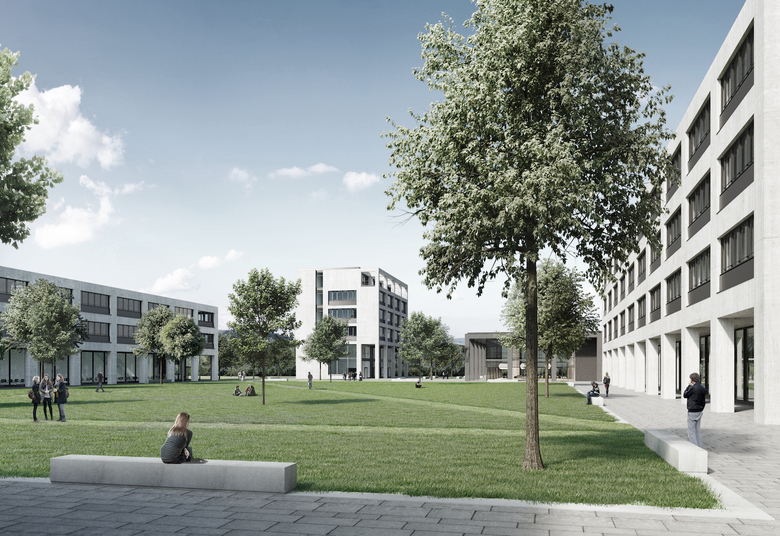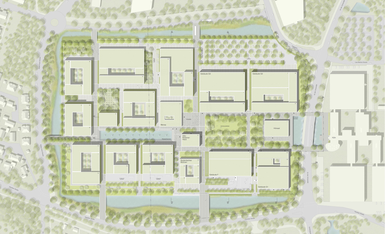 Der neue Universitätscampus orientiert sich an einem Masterplan von Ortner & Ortner aus dem Jahr 2008 und umfasst vier Institutsbauten, die einen zentralen Campus im Norden und Süden flankieren. Sie werden ergänzt um ein Hörsaalgebäude, eine Mensa und ein Haus der Studierenden mit Seminarzentrum, Bibliothek und Saalgemeinschaften, die als Solitärbaukörper ins Grün des Campus eingebettet sind. Die räumliche Staffelung der Bauvolumina in der Horizontalen und Vertikalen sowie zueinander versetzt geführte Erschließungs- und Wegeachsen prägen das architektonisch-landschaftliche Ensemble.