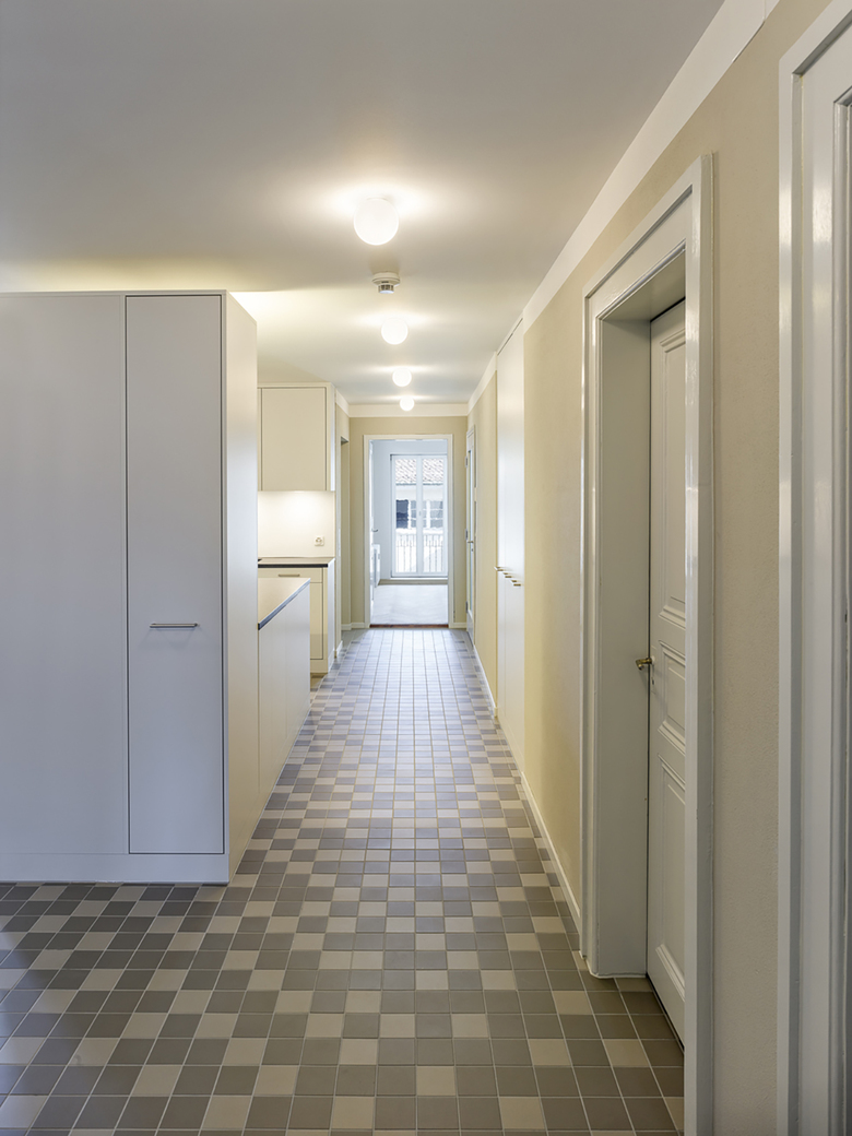 In enger Zusammenarbeit mit der Denkmalpflege der Stadt Bern werden nach einem Besitzerwechsel in der Liegenschaft ab dem 2. Obergeschoss wieder Wohnungen eingeplant. Im 2. und 3. Obergeschoss können jeweils gassenseitig eine repräsentative 3.5-Zimmerwohnung sowie eine hofseitige 1.5- resp. 2-Zimmerwohnung realisiert werden. In den beiden darüber liegenden Geschossen entstehen eine 4.5- und eine 3.5-Zimmer-Wohnung mit grosszügigen, privaten Dachterrassen. Damit die Wohnungen optimal erschlossen werden können, werden das bestehende Treppenhaus sowie der Liftkern neu bis ins 5. Obergeschoss erweitert und in einen Anbau integriert. Die gesamten haustechnischen Anlagen inklusive der Lüftungs- und Kälteanlage des Restaurants werden erneuert, die Sandsteinfassade gegen die Kramgasse sowie die Dach- und Terrassenflächen werden saniert und die Hoffassaden erhalten ein neues einheitliches Gepräge, welches sich an das vorhandene, historische Putzrelief anlehnt. Sämtliche baulichen Massnahmen verfolgen dabei einen betont integrativen Entwurfsansatz, um eine überzeugende architektonische Gesamtstimmung zu erreichen.