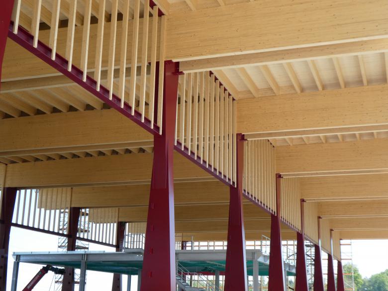 Die 13m hohe Halle besteht aus massgefertigten Stahlstützen die in Bodenplatte mit Riegelsystem eingespannt sind. Die Bodenplatte aus Monobeton und das kombinierte Retentionsbecken sind tiefenfundiert. Das Holzdach kragt auf zwei Seiten bis zu 10m aus. In der Halle befindet sich ein Zwischenboden aus einer Stahlkonstruktion mit Monobeton als Verbunddecke.