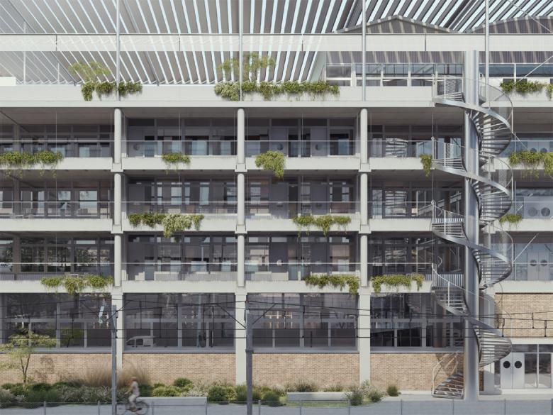 Die Aussteifung des Gebäudes gegen Wind- und Erdbebenkräfte erfolgt in Querrichtung über die beiden inneren Erschliessungskerne, welche klassische Ortbetonkonstruktionen sind, und in Längsrichtung über Windverbände in den Fassaden, die dem Industriecharakter geschuldet mittels Stahlzugstangen gebildet werden.
