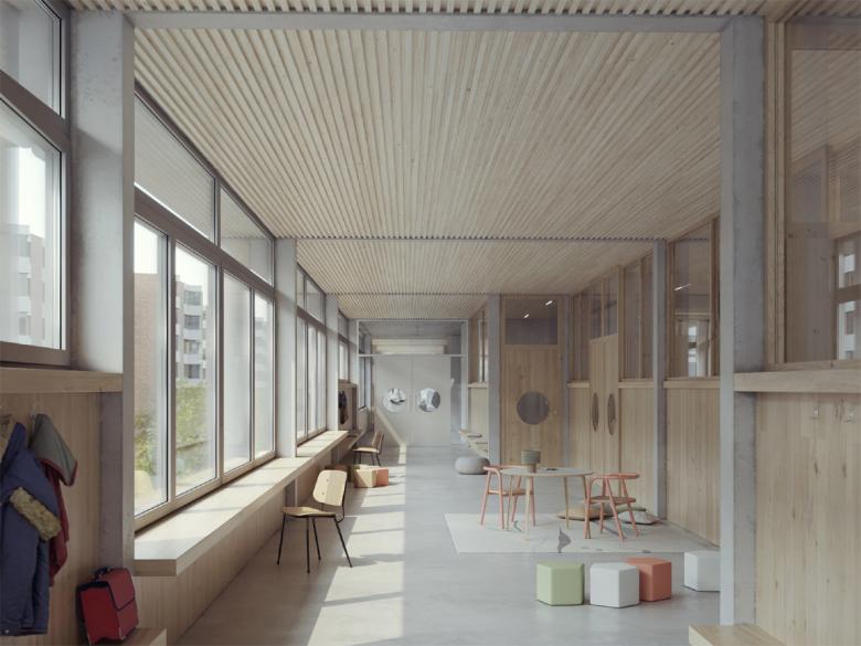 In den Obergeschossen über den Hallen bleibt die primäre Struktur aus Stützen und Hauptträgern in Betonelementbauweise. Die sekundäre Konstruktion, also die eigentlichen Deckenflächen, sind Brettstapeldecken mit werkseitigem Betonüberzug. Im Aussenbereich der Lernbalkone, wo die Hauptträger über gedämmte Schubverbindungen am Innenbereich angehängt sind, sind die Platten – auch aus Brandschutzüberlegungen – nur als Betonelemente vorgesehen.