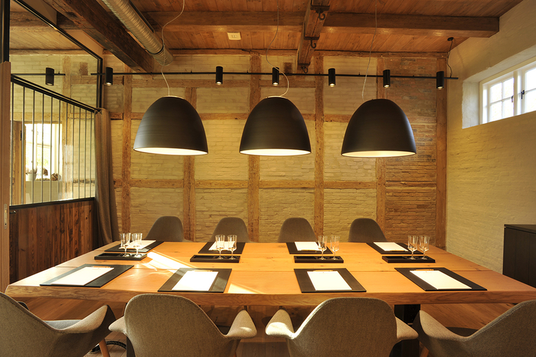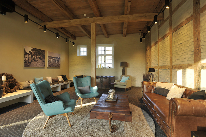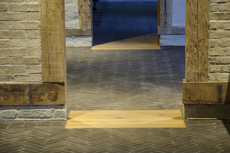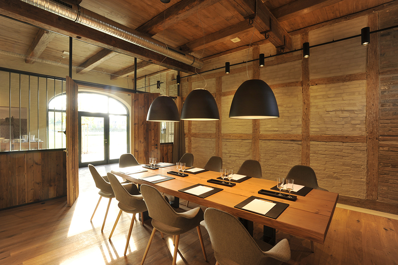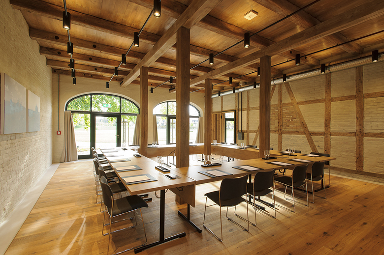 Die eigens gestalteten Leuchten heben die sanierten Holzbalkendecken und Mauerwerkswände hervor und lassen diese als Gestaltungselemente atmosphärisch wirksam werden. Entree und Erschließungsbereiche wurden in dunklem Klinker gepflastert, die Durchgänge mit breiten Holzschwellen im Boden abgesetzt. Die Tagungsräume erhielten einen „Teppich“ aus Eichenholzdielen, der sich mit einem Randfries aus Estrichbeton gegen die historischen Bestandswände abgrenzt.