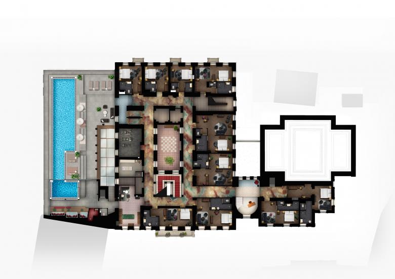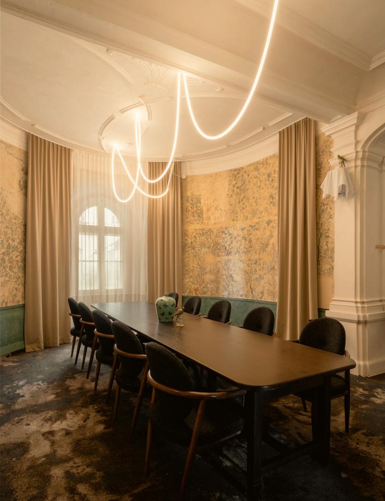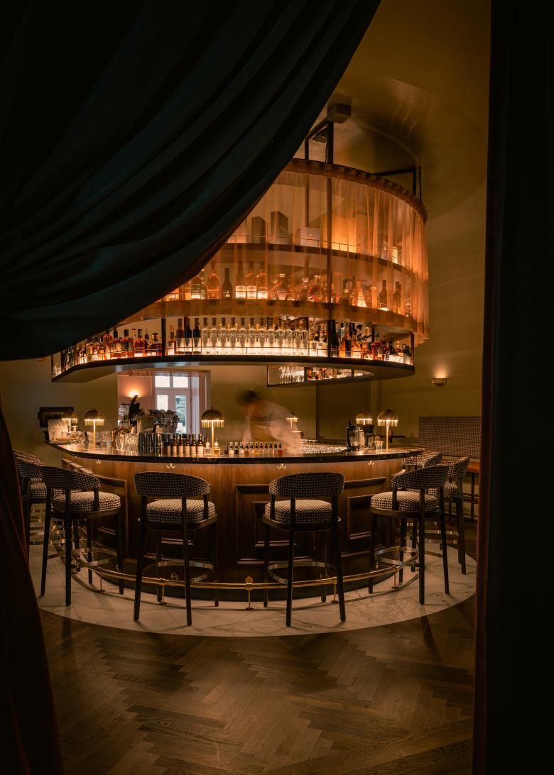 When guests enter the new Grand Hotel Straubinger, they are immediately captivated by the history of this venerable building. In the historical reception area, their room cards are handed to them from a velvet-lined drawer as if they were pieces of jewellery. The grand staircase that leads to the upper floors is straight ahead, while the F&B area is located to the right of it. The double doors of the café, which can seat 40 in total, give onto Straubingerplatz, where the outdoor seating directly on the square can accommodate 12 guests. The bar and the salon directly adjacent to the café provide the perfect setting for the end of day; the salon can be closed off with curtains as needed. In line with the principle of “working with the layers of the past”, all areas feature a contrasting mix of old and new, such as the combination of the existing wainscoting with modern, adapted wall panelling. “Depending on the time of day and how the respective areas are used, the furniture and colour scheme get progressively darker,” says BWM project manager Marlene Gesierich. The predominant colour used in the café is the modern shade “strawberry cream”. In the course of renovations, sage-green layers of paint were discovered beneath the old wall panelling in the salon and bar, inspiring the use of that same colour for the new look. And the Straubinger cake serving trolley is a nostalgic detail …