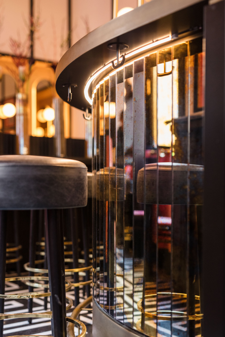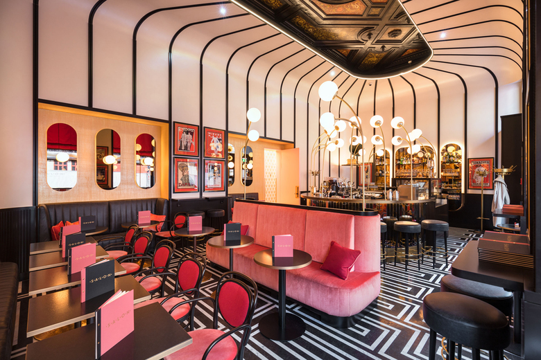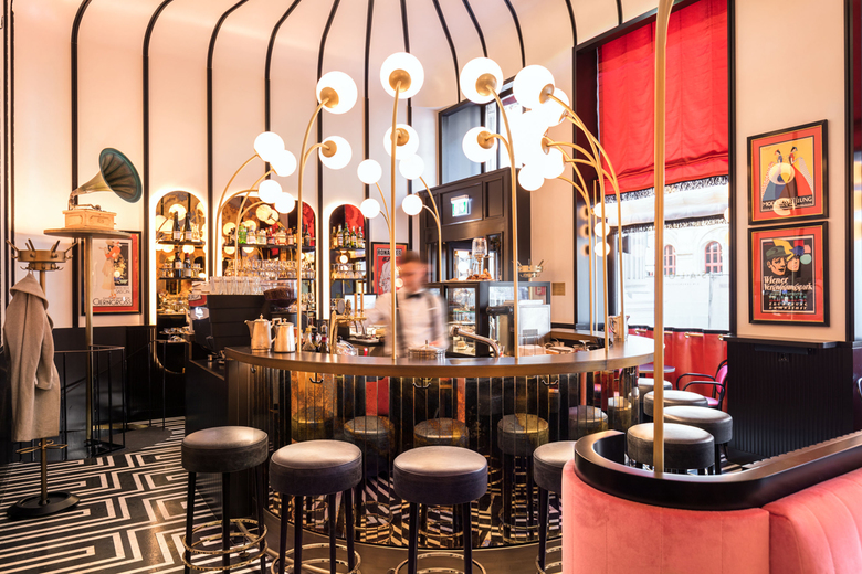 BWM Architekten haben nach dem Re-Design des Sacher Eck Ende 2017 auch die ehemalige Sacher Stube einer Neugestaltung unterzogen: Im Salon Sacher, so der neue Name, gehen die Farben Schwarz und Koralle ganz im Stile der 1920er- und 1950er-Jahre Hand in Hand. Gebogene Kugelleuchten setzen die Bar als Centerpiece in Szene, getönte Spiegel, schwarze Linien und metallische Effekte runden das Bild stimmig ab. Absoluter Hingucker ist eine erhaltene Stuckdecke – bis dato versteckt hinter dem Plafond, haben BWM diesem historischen Juwel mittels eines großen Deckenausschnitts wieder zu neuem Glanz verholfen.