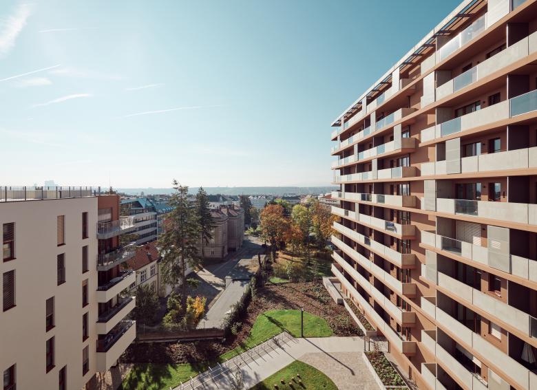 Bauplatz 6 mit seinen 35 Metern Länge und der L-förmige Bauteil 7 bilden ein gemeinsames Ensemble und definieren den Ordeltpark als Stadtraum neu. Gleichzeitig wurden Freiraum-Qualitäten mittels eines großzügigen Innenhofes geschaffen, das Areal wird darüber hinaus von üppigen Baumlandschaften gerahmt.