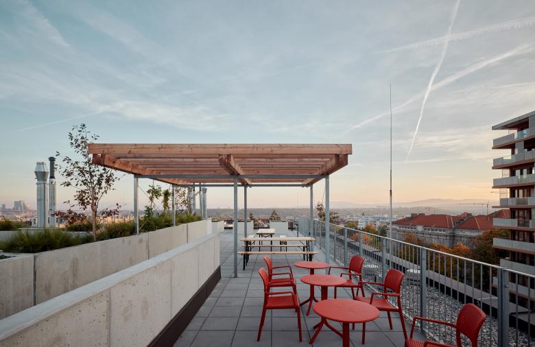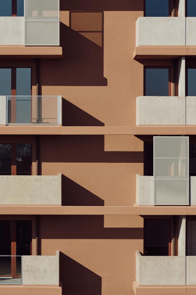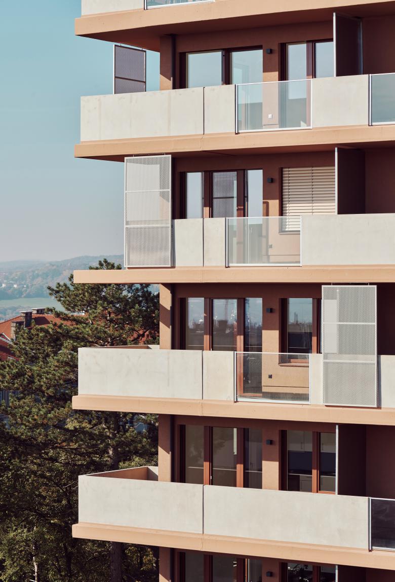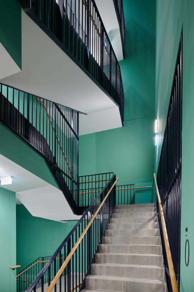 Das Gebäude auf Bauplatz 7 staffelt sich in gesamt sieben Geschosse, die dank eines durchgängigen Lichtbrunnens allesamt mit natürlichem Licht versorgt werden, und überdies freien Blick auf den Park und bis hin zur Gloriette in Schönbrunn bieten. Am Dach entstand eine 150m² große Gemeinschaftsterrasse mit schattenspendender Pergola, Urban Gardening-Zone mit großzügigen, automatisch bewässerten Hochbeeten sowie einer Indoor und einer Outdoor Küche, die den Bewohner:innen zur Verfügung steht. An der Fassade mischen sich farblich Ziegel- und Erdtöne mit hellem Putz, vorspringende Elemente setzen sich optisch deutlich von zurückspringenden ab. Innen wurde mit konträren Farben gearbeitet und so finden sich hier etwa grüne Wände oder blaue Fliesen. Das großzügige Stiegenhaus, ebenfalls in sattem Grün gehalten, wurde mit hochwertigen Materialien wie etwa Handläufen aus Eiche oder Stockwerksbeschriftung mit Metallbuchstaben bestückt.