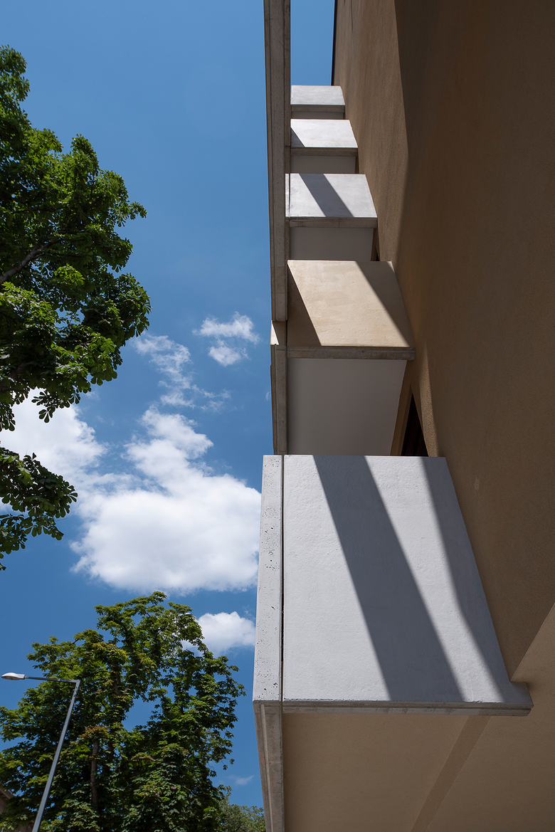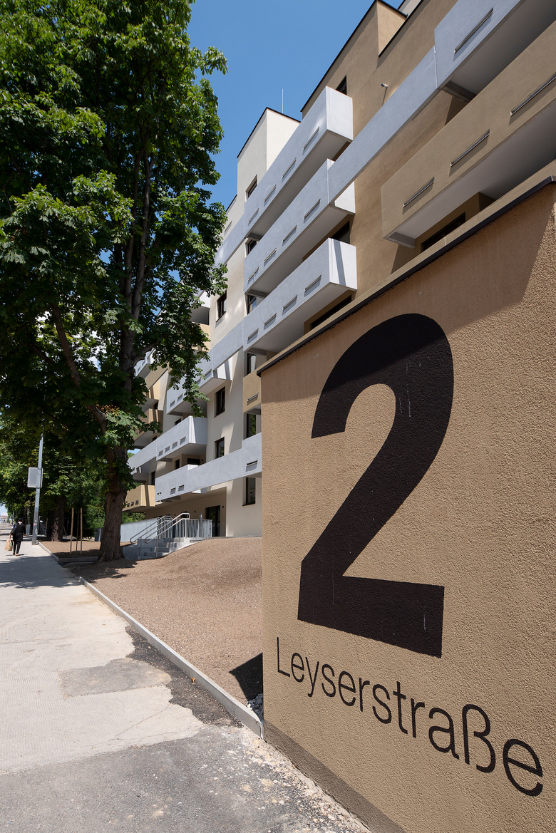 Die Balkone aus verschiedenfarbig lasiertem Sichtbeton umrahmen den gesamten Gebäudekomplex und verleihen dem Terrassenhaus durch die starke lineare Anordnung sein markantes Aussehen. Nadelstreifartige horizontale Schlitze dienen der Entwässerung der Balkone und erzeugen gleichsam eine Leichtigkeit. Der gewachsene Baumbestand an der Leyserstraße konnte durch umsichtige Maßnahmen erhalten bleiben und trägt zur Steigerung der Wohnqualität des Wohnbaus bei.