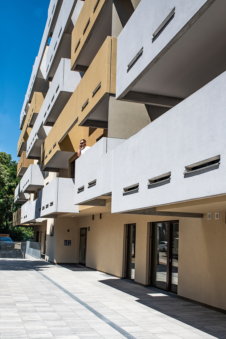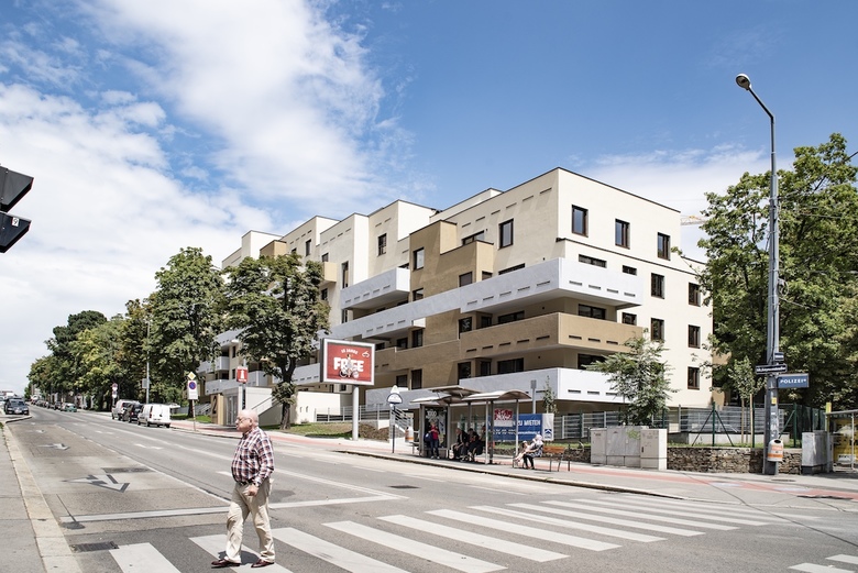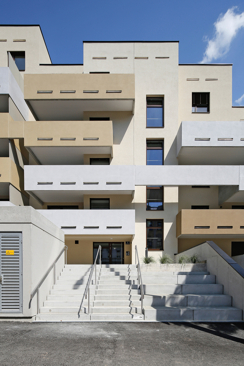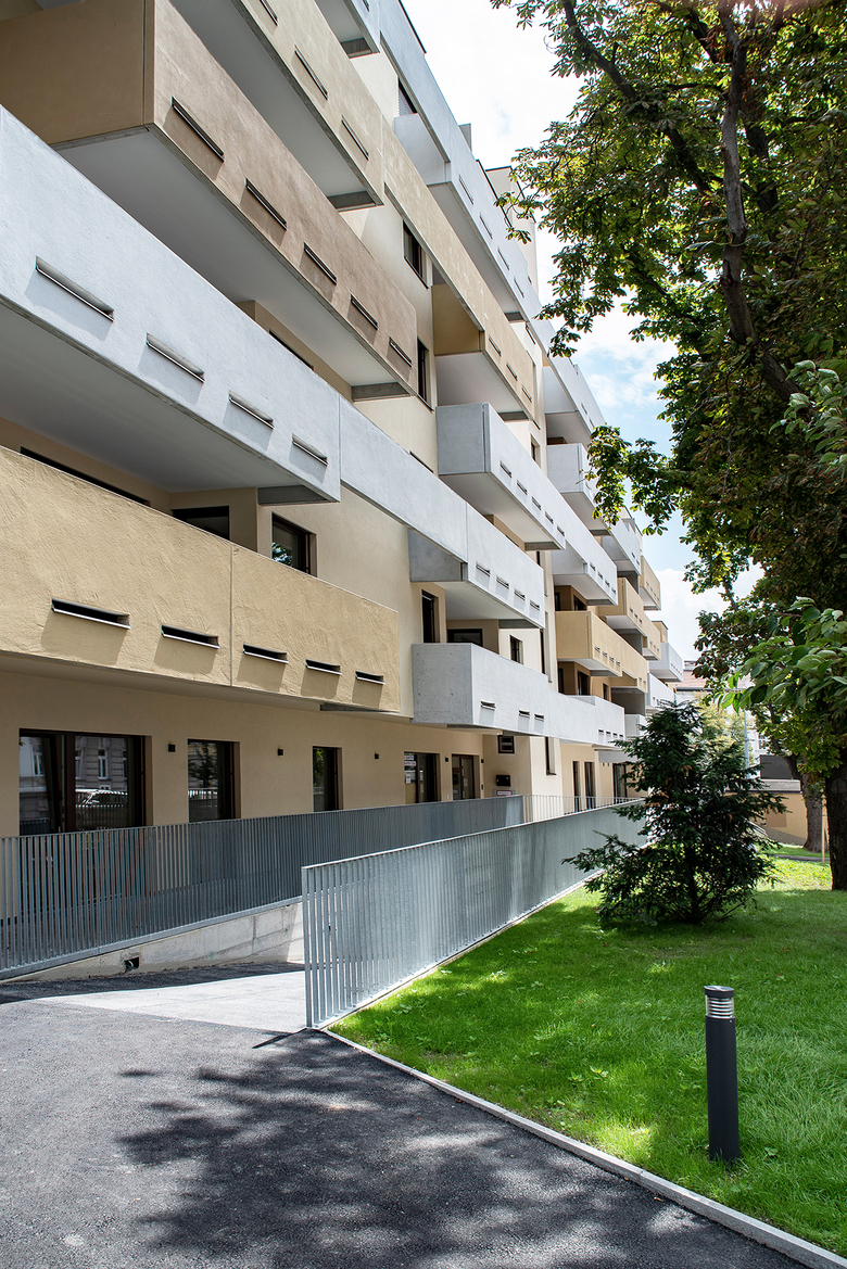 Planung und Errichtung eines Wohnbaus als „Terrassenhaus“ mit 80 Wohnungen auf sechs Stockwerken, einem integriertem Kindergarten und einer Polizeiinspektion. Das Gebäude mit der luftigen Betonfassade verfügt über eine hervorragende Infrastruktur und ist sehr gut an die Umgebung angebunden.