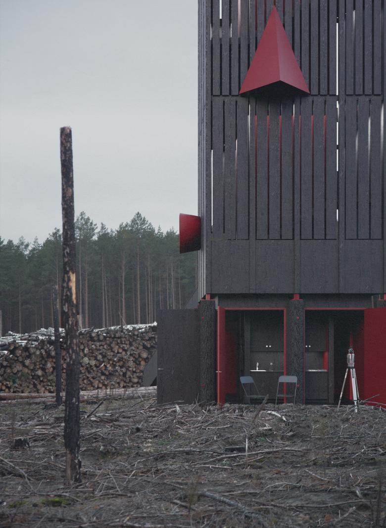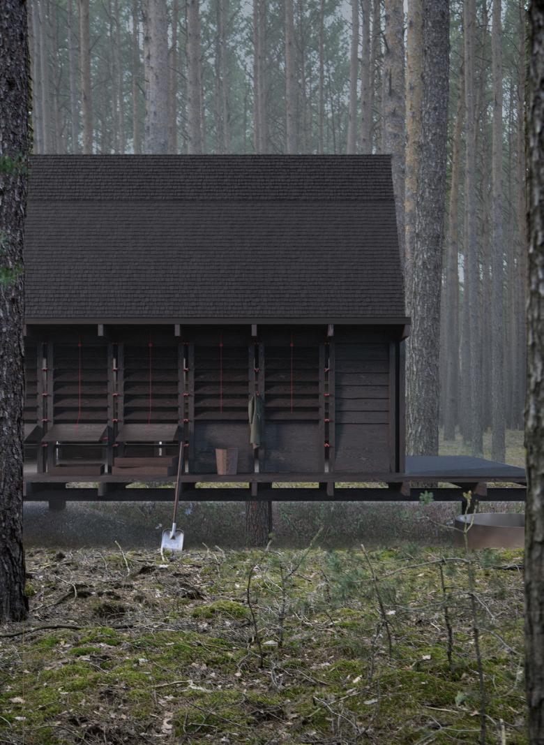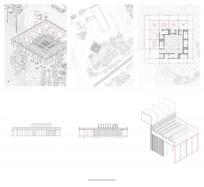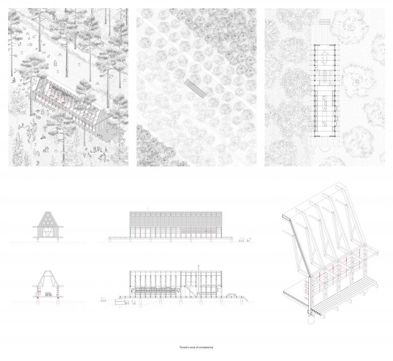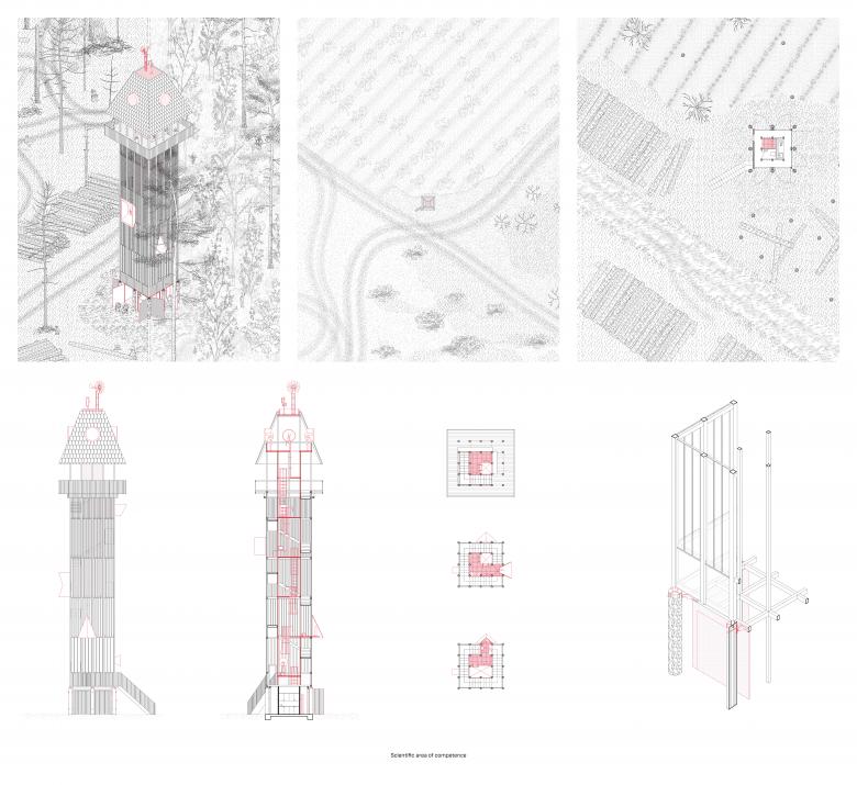 The focus of the design concept is the transformation of individual knowledge into collective knowledge, as the forest fires represent a challenge for society as a whole. Visibility and transformation of the buildings through use, time and volume are key aspects of the design and determine the appearance and functionality of the architecture. The hybridity in the designs and the constructive details themselves attempts to unite the two levels of poetry and reality of the forest habitat.