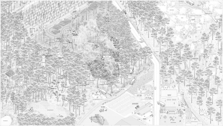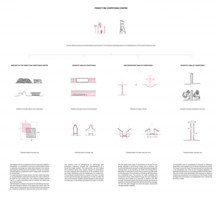 In response to the increase in forest fires, the state Brandenburg is planning to establish a forest fire competence center for coordinated collaborations between various disciplines such as forestry, firefighting and science. Our design reinterprets the current planning for the center to include a public-effective level and creates hybrid structures that promote synergies of seemingly independent processes. These four structures, each dedicated to a specific aspect of wildfire management, organize the center as a decentralized network.
