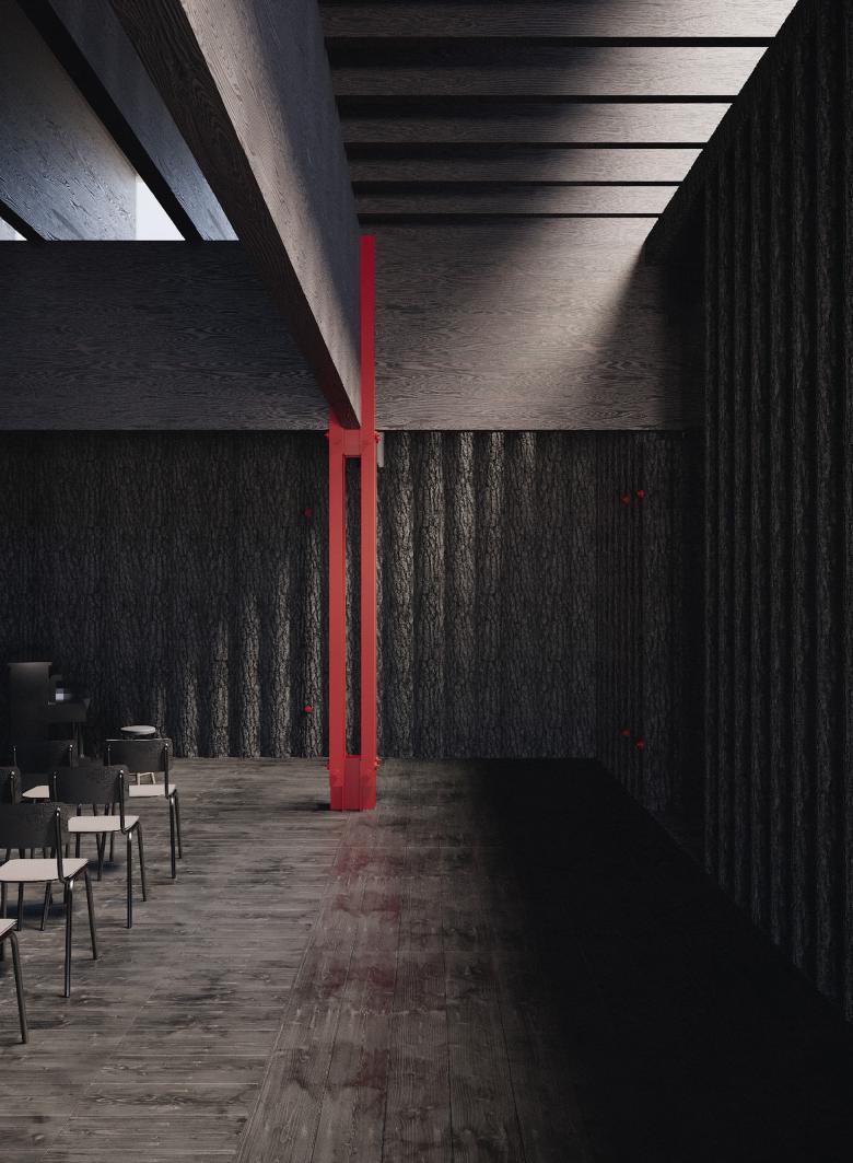 Materiality is a central element of the design concept. After forest fires, the charred trees are felled and the potential of a value chain remains largely unused. The structures are intended to test how this wood can be used and refined by the fire itself in order to promote the sustainable use of wood as a resource.
