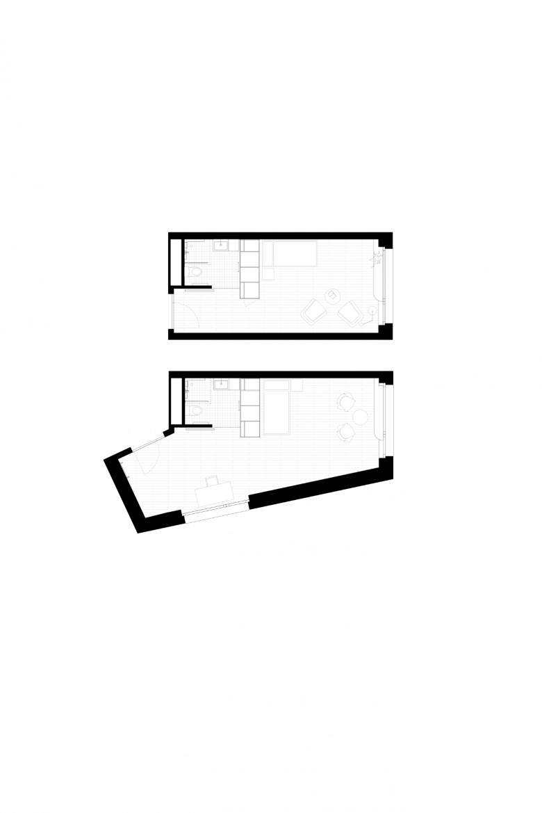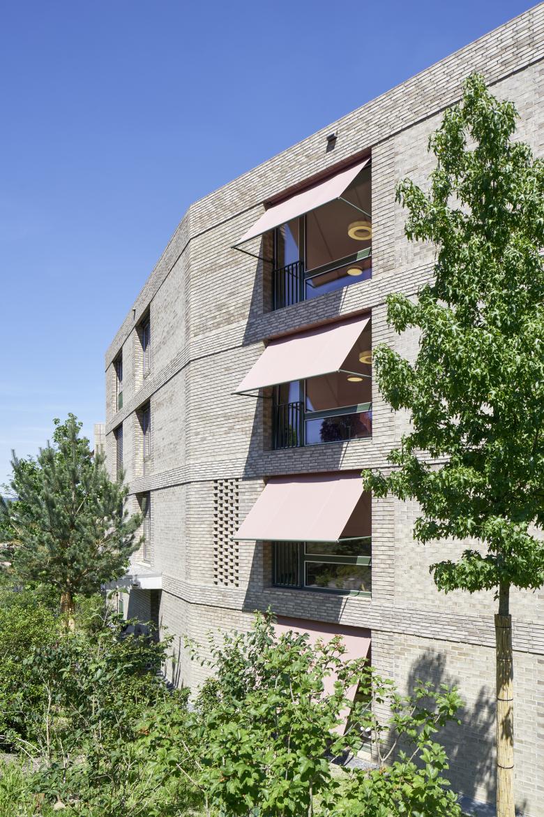 Die zweibündige Grundrissfigur ermöglicht es, alle Zimmer und Aufenthaltsbereiche lärmabgewandt zu organisieren. Ausweitungen an den Gebäudeenden und grosszügige Ausblicke bei den Erschliessungen gewähren trotzdem einen unmittelbaren Bezug auf die Nidelbachstrasse und hangaufwärts ins Quartier. Durch den zentralen Liftkern wird die Anlage auf angemessene Weise zoniert und betrieblich optimal erschlossen.