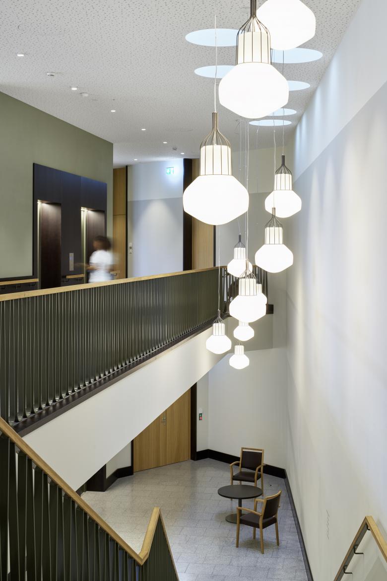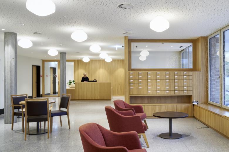 Der zentral gelegene Empfang ist direkt an die Administration angegliedert. Von der Eingangshalle führt eine grosszügige Treppe mit Oblicht vor den Liften ins erste Obergeschoss zu den Gemeinschaftsbereichen des Hauses. Anlieferung, Parking, Lagerräume für Küche, Garderoben und Aufbahrungsraum sind im Sockelbereich neben dem Haupteingang platziert.
